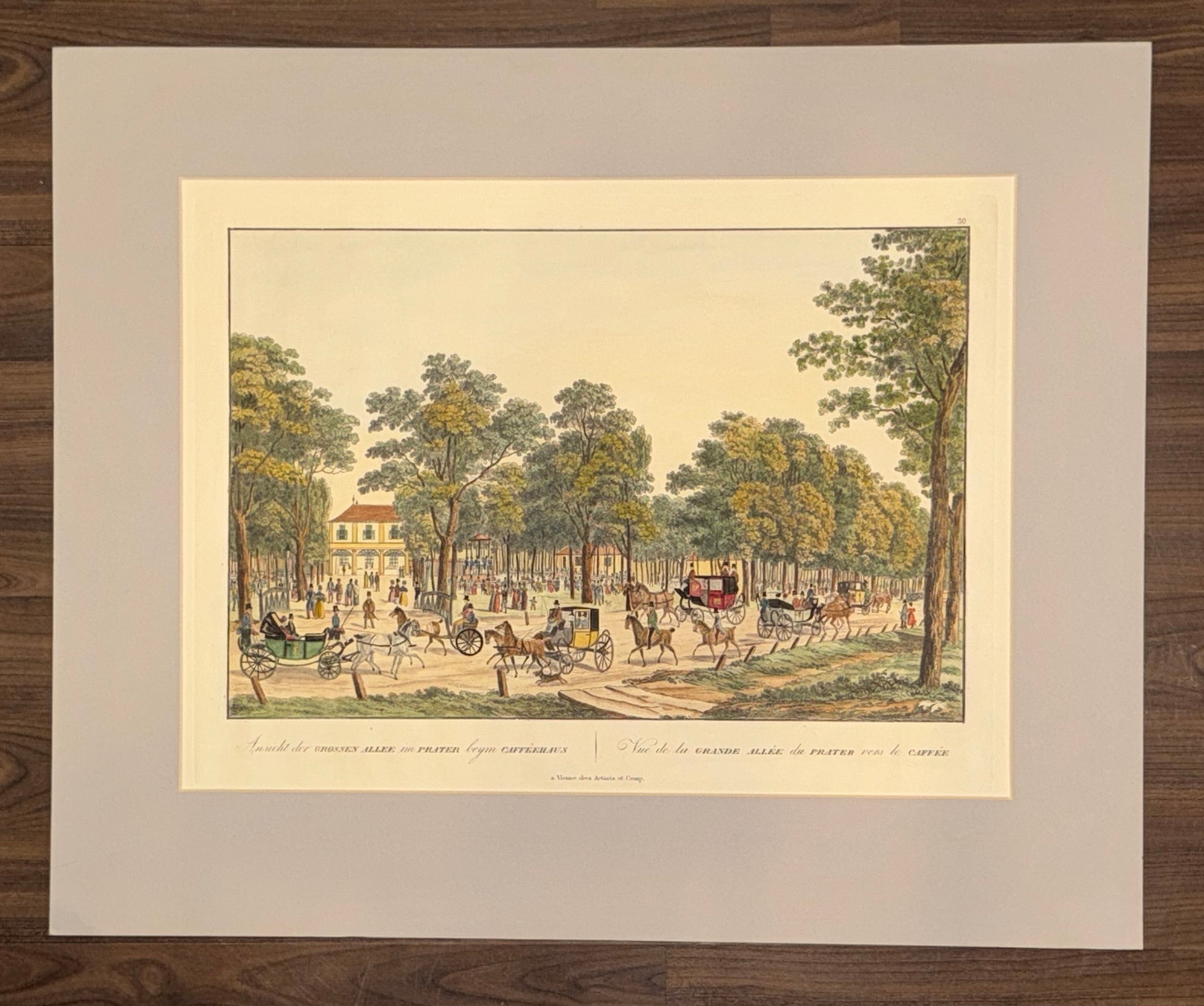 Originaler, altkolorierter Kupferstich mit Blick in die berühmte Wiener Praterallee. Vorbeiziehende Pferdekutschen, elegante Spaziergänger und das lebendige Treiben machen diese Szene zu einem eindrucksvollen Zeugnis bürgerlicher Gesellschaftskultur im 19. Jahrhundert.