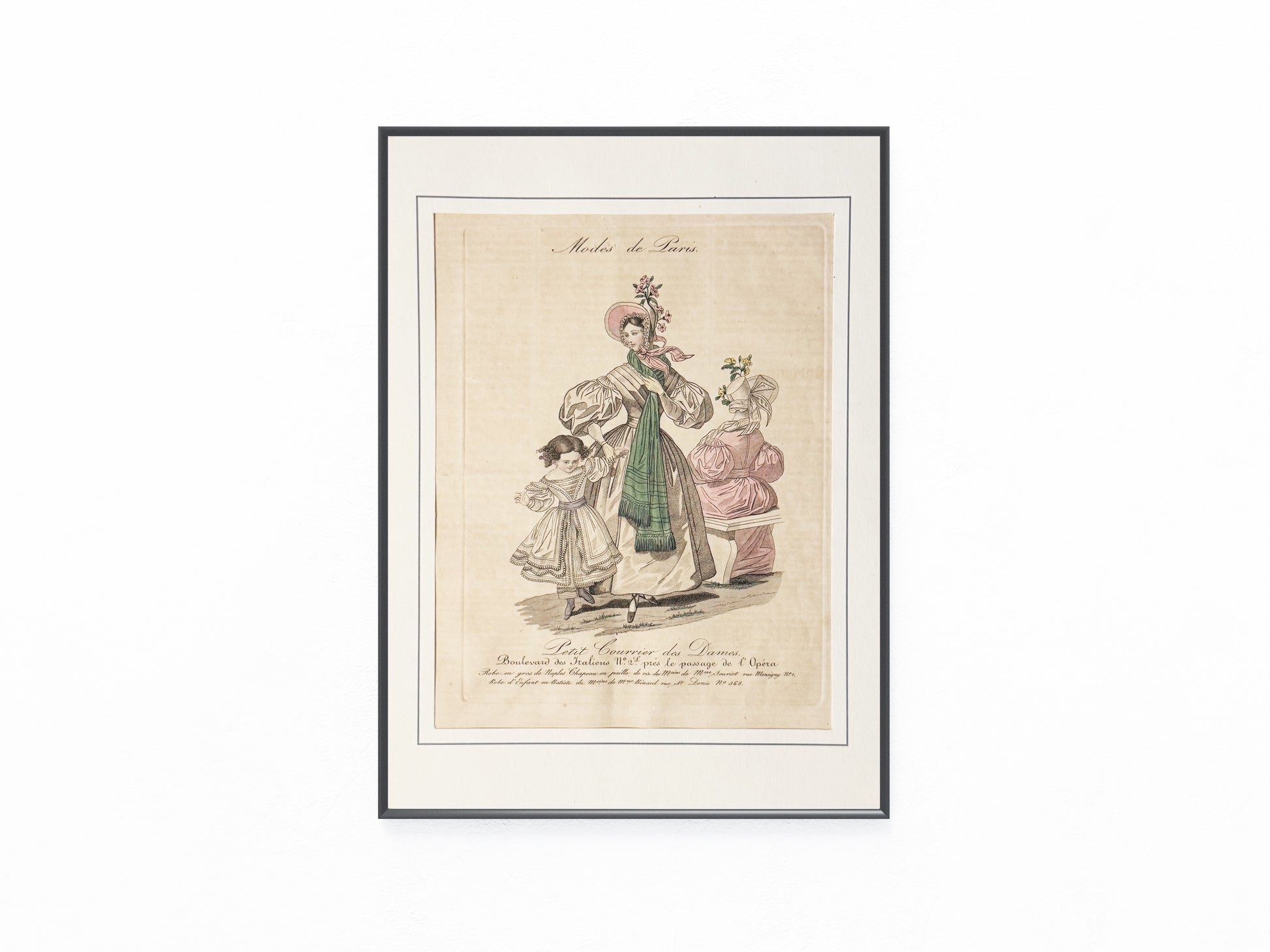 Feine handkolorierte Modegrafik aus der Pariser Zeitschrift Petit Courrier des Dames, erschienen um 1835. Dargestellt sind eine elegant gekleidete Dame mit Sonnenschirm, ein Kind in zarter Spitzenkleidung sowie eine sitzende Frau in rosa Kleid. Die Illustration trägt die Überschrift Modes de Paris und ist im Original französisch betitelt und beschriftet. Das Blatt ist in ein schlichtes Papierpassepartout eingesetzt.
