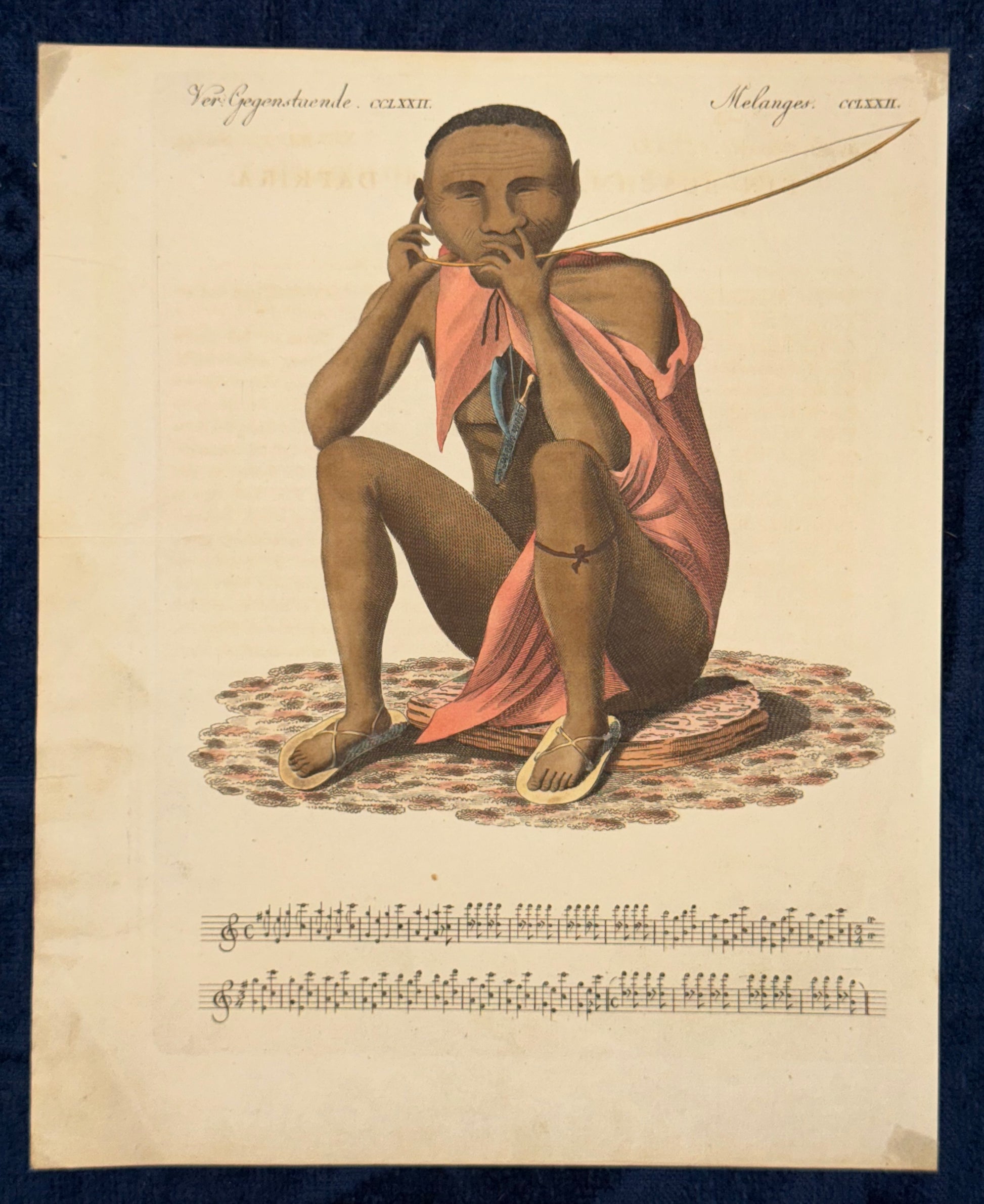 Antiker ethnografischer Druck aus einer europäischen Sammelpublikation des 19. Jahrhunderts. Gezeigt wird eine sitzende männliche Figur mit traditionellem Bogeninstrument – vermutlich aus der Region Süd- oder Ostafrika. Auffällig ist die beigefügte Notenzeile, die eine musikalische Überlieferung oder Transkription vermuten lässt.