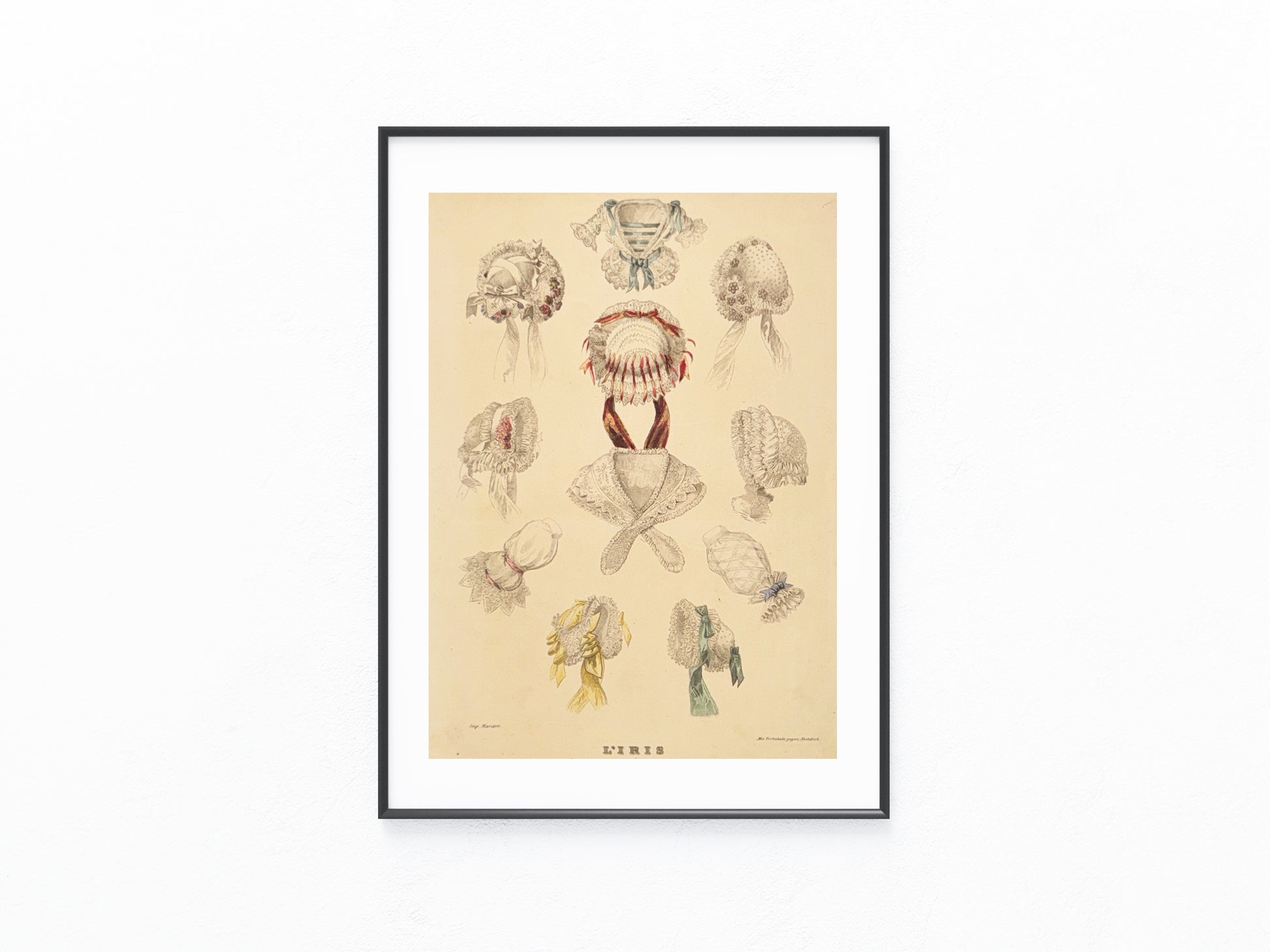 Originale Mode-Tafel aus der renommierten französischen Publikation L’IRIS, um 1850. Die Grafik zeigt eine Vielfalt an Damenhauben, Spitzenaccessoires und zarten Schleifen – liebevoll koloriert und detailreich illustriert. Ein echtes Stück Modegeschichte.