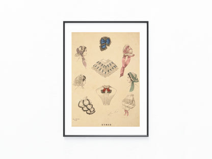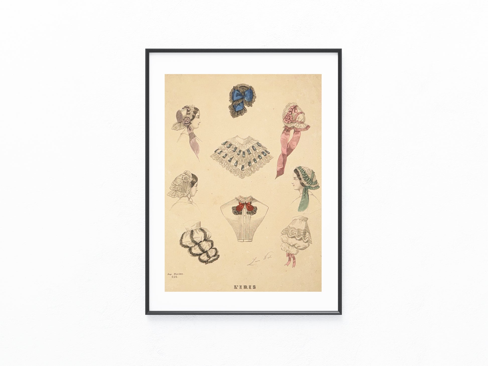 Originale Modeillustration aus der französischen Zeitschrift L’IRIS, um 1850. Diese liebevoll handkolorierte Grafik zeigt eine Auswahl stilvoller Damenaccessoires des 19. Jahrhunderts – von aufwendig verzierten Spitzenhauben über Schleifenkrägen bis hin zu fein gearbeiteten Stoffdetails.