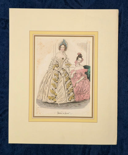 Elegantes Modeblatt aus der Reihe Modes de Paris, ca. 1850. Die liebevoll kolorierte Illustration zeigt zwei Damen in prachtvollen Roben mit opulenten Schleifen, Spitzen und typischen Accessoires des französischen Hochadels – ein Highlight der Biedermeier-Zeit.