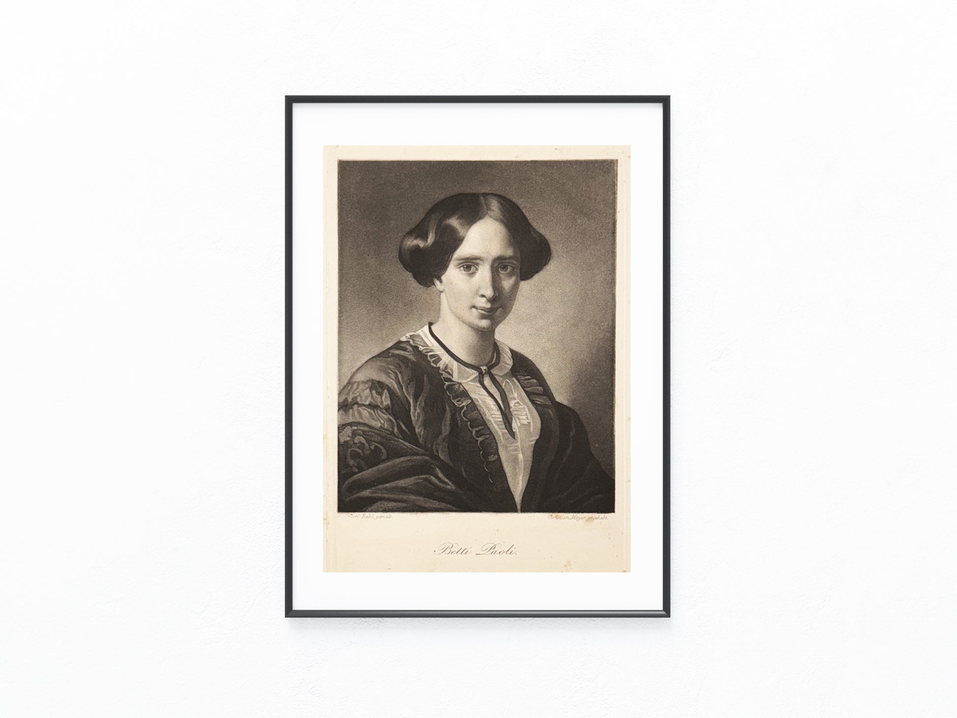 Ausdrucksstarker Stahlstich der österreichischen Schriftstellerin Betti Paoli (1814–1894), entstanden um 1855. Die talentierte Autorin galt als eine der führenden Intellektuellen des Biedermeier. Der feine Druck zeigt sie mit aufmerksamem Blick, edlem Gewand und schlichter Frisur – ein eindrucksvolles Porträt einer klugen, selbstbewussten Frau ihrer Zeit.