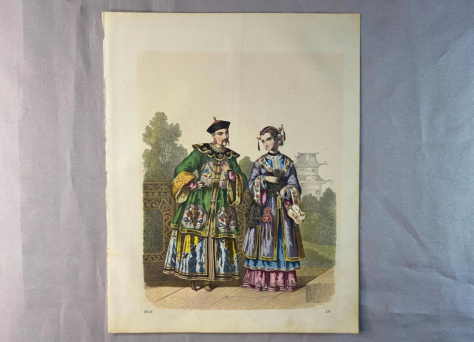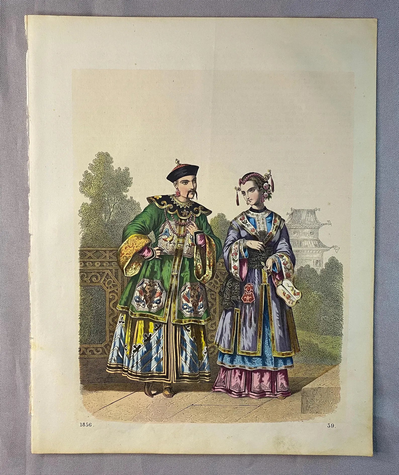Original Farblithografie von 1856 mit detailreicher Darstellung zweier chinesischer Figuren in prächtigen Gewändern. Links ein kaiserlicher Würdenträger in reich bestickter Robe mit Tiermotiven, rechts eine Dame in farbenfrohem Seidenkleid mit kunstvoll verziertem Kopfschmuck. Im Hintergrund ein Garten mit Pavillon und Pagode, der das exotische Flair der Szene verstärkt.