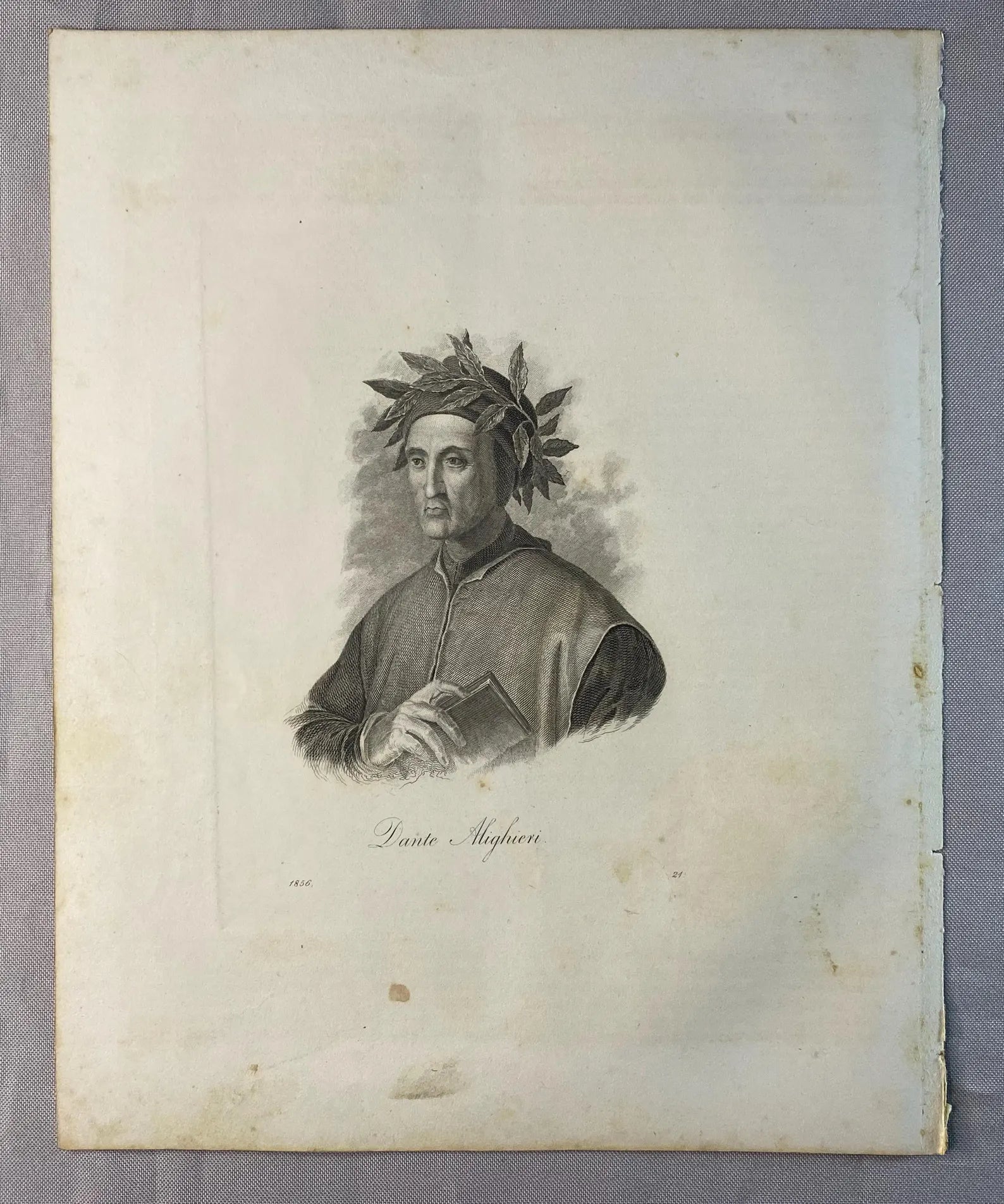Original Stahlstich von 1856 mit klassischem Porträt des italienischen Dichters Dante Alighieri. Dargestellt ist er mit Lorbeerkranz als Symbol dichterischer Würde, in der Hand ein Buch als Hinweis auf sein literarisches Schaffen. Die feine Linienführung und die klare Schattierung verleihen dem Blatt eine eindrucksvolle Ausdruckskraft.