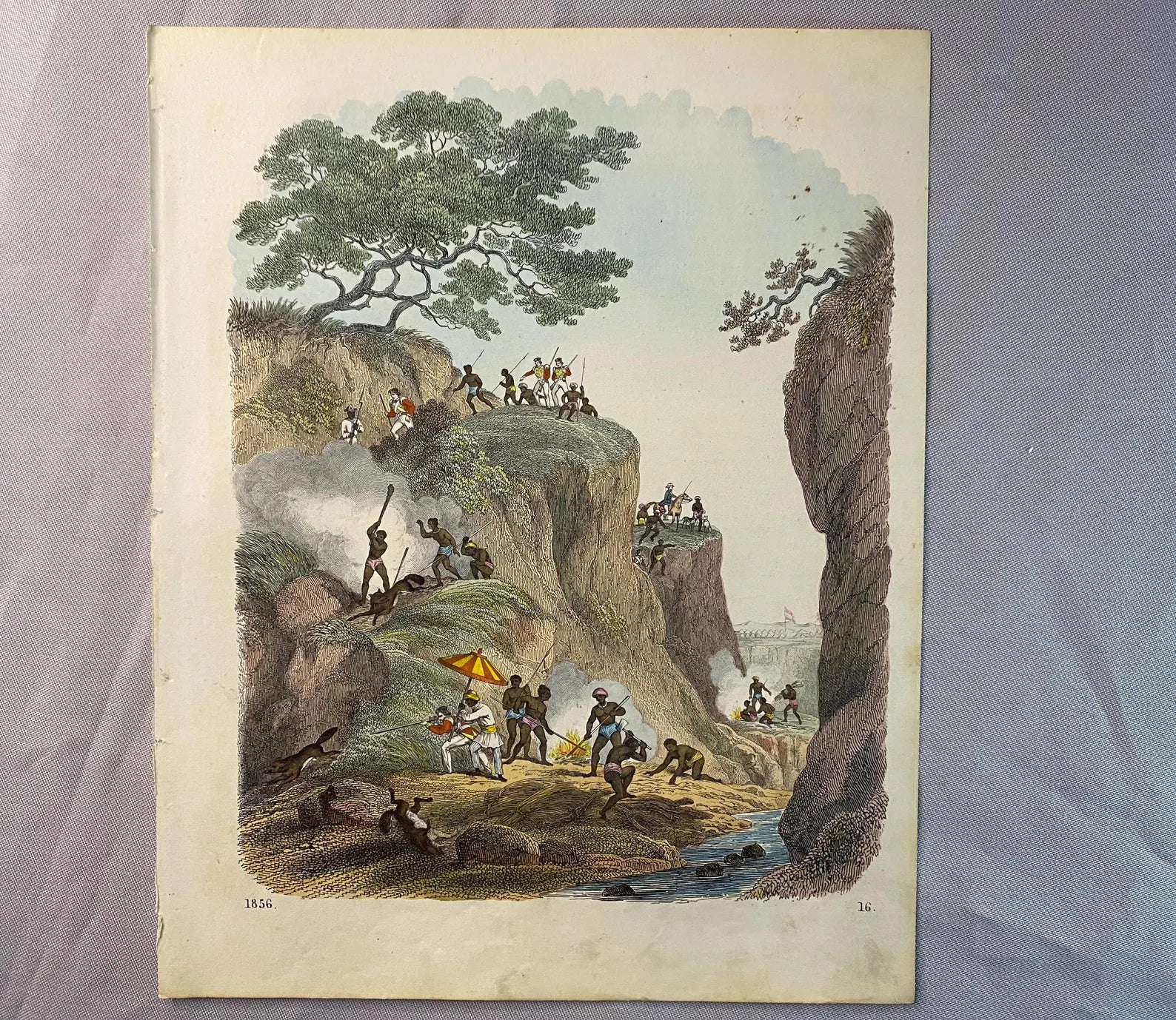 Original Farblithografie von 1856 mit lebendiger Darstellung einer Jagd in felsiger Landschaft. Im Vordergrund sind Jäger mit Speeren und Stöcken zu sehen, die von einem Feuer aus die Tiere aufscheuchen. Weitere Figuren klettern über die Felsen, während im Hintergrund Gruppen von Eingeborenen mit verschiedenen Jagdmethoden dargestellt sind. Die detailreiche Ausführung zeigt eindrucksvoll die Jagdpraxis des 19. Jahrhunderts in exotischer Umgebung.