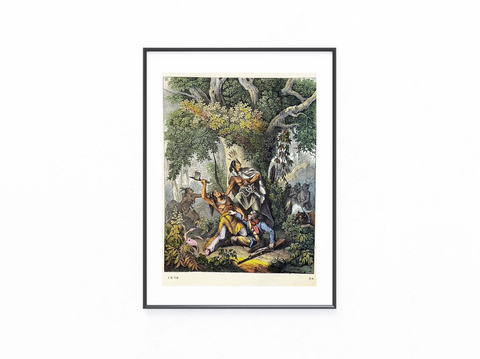Original Farblithografie von 1858 mit dramatischer Darstellung eines Angriffs durch Indianer im Wald. Im Vordergrund ein Krieger mit erhobenem Tomahawk über einem am Boden liegenden Gegner, während weitere Kämpfer im Hintergrund zwischen Bäumen und Felsen hervortreten. Die detailreiche Szene mit dichter Vegetation und exotischer Tierwelt vermittelt eindrucksvoll die romantisierte Sicht des 19. Jahrhunderts auf das Leben und die Kämpfe nordamerikanischer Ureinwohner.