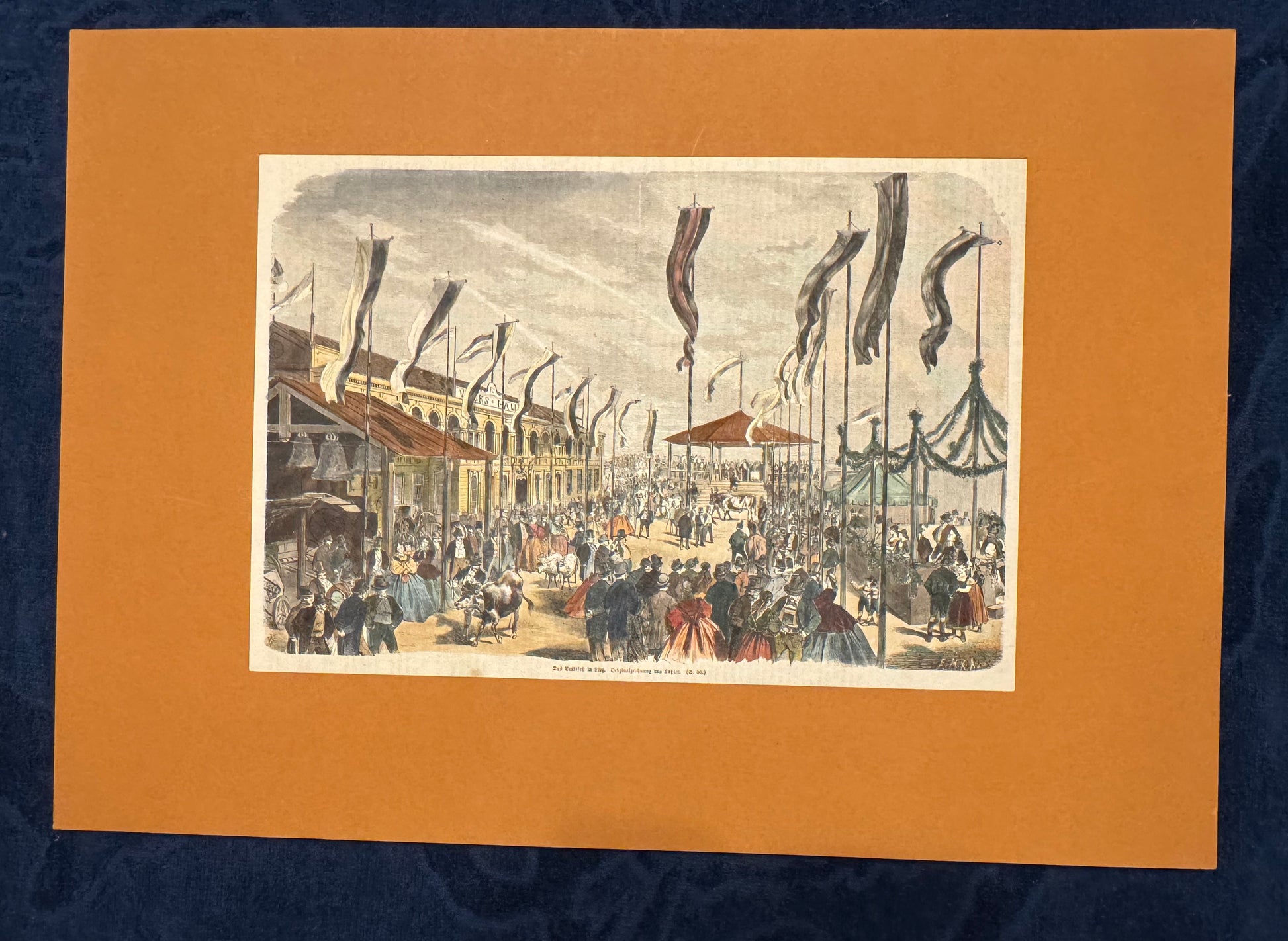 Farbig gefasster Original-Stich um 1860. Dargestellt ist die festliche Eröffnung im Wiener Prater mit zahlreichen Besuchern, festlich geschmückten Pavillons, wehenden Fahnen und geschäftigem Treiben – ein lebendiges Zeitdokument der österreichischen Geschichte.