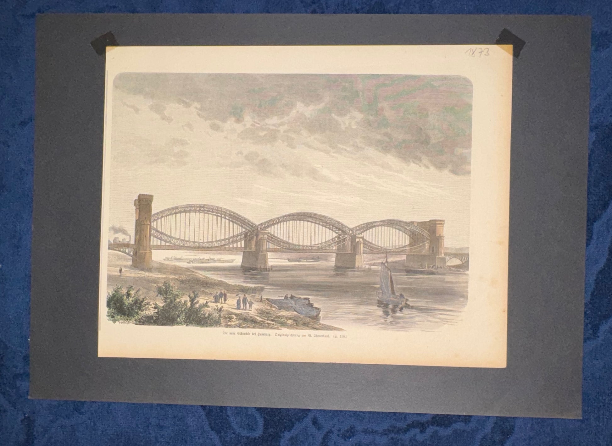 Stimmungsvoll kolorierter Original-Holzstich von 1873 mit der Darstellung der neuen Elbbrücke bei Hamburg. Die monumentale Eisenkonstruktion überspannt den Fluss mit markanten Bogenstrukturen. Im Vordergrund sind Spaziergänger und Boote auf der Elbe zu sehen – ein lebendiges Zeugnis der Technik- und Architekturgeschichte des 19. Jahrhunderts.