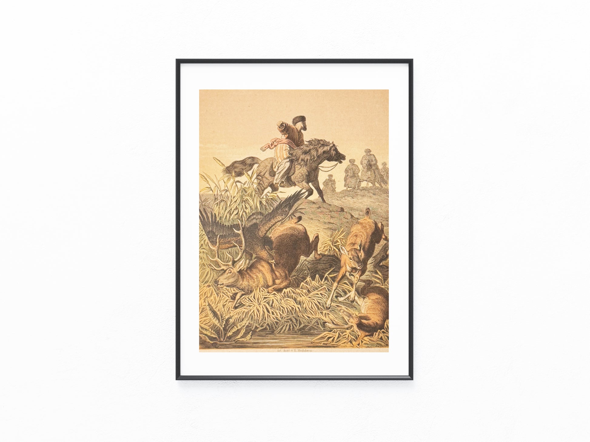 Seltene Original-Lithografie aus dem 19. Jahrhundert mit Darstellung einer dramatischen Beizjagd. Im Vordergrund erlegt ein Adler ein Wildtier, während weitere Tiere in Panik fliehen. Im Hintergrund reiten Kirgisen auf Pferden heran – eine eindrucksvolle Szene aus der Jagdkultur Zentralasiens, detailreich und farbkräftig umgesetzt.