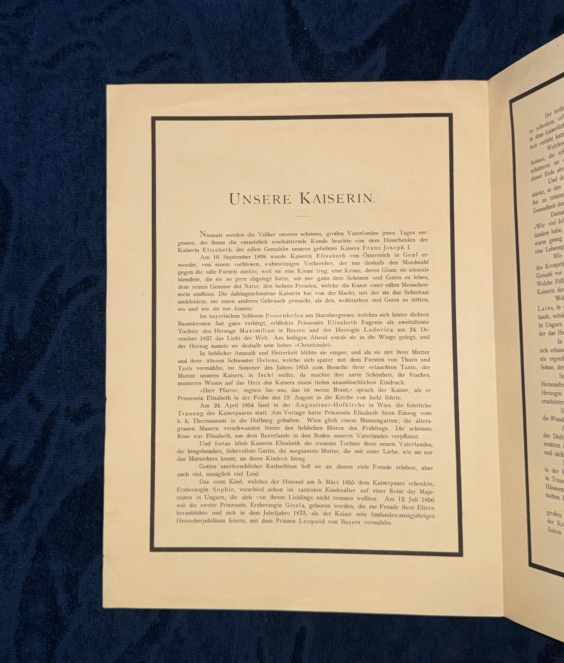 • Vierseitiger Innenteil mit Texten: „Unsere Kaiserin“ und der bewegenden Trauerrede „An meine Völker“ von Franz Joseph I.