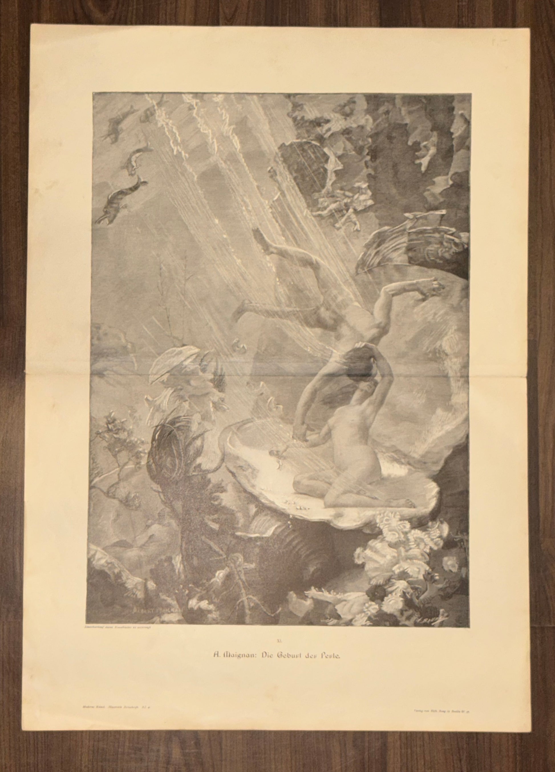 Schöne allegorische Szene nach Albert Maignan: „Die Geburt der Perle“. In einer geöffneten Muschel erhebt sich eine nackte weibliche Figur, umgeben von Lichtstrahlen, Wasserwesen und floraler Ornamentik. Das Blatt verbindet klassische Mythologie mit der Symbolik der Reinheit und Kostbarkeit der Perle – eine Komposition, die an die Geburt der Venus erinnert.