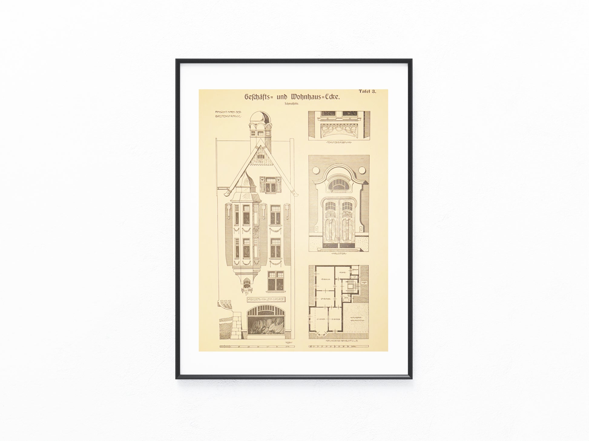 1900 Jugendstil Geschäfts- und Wohnhaus | Original Baukunst Druck