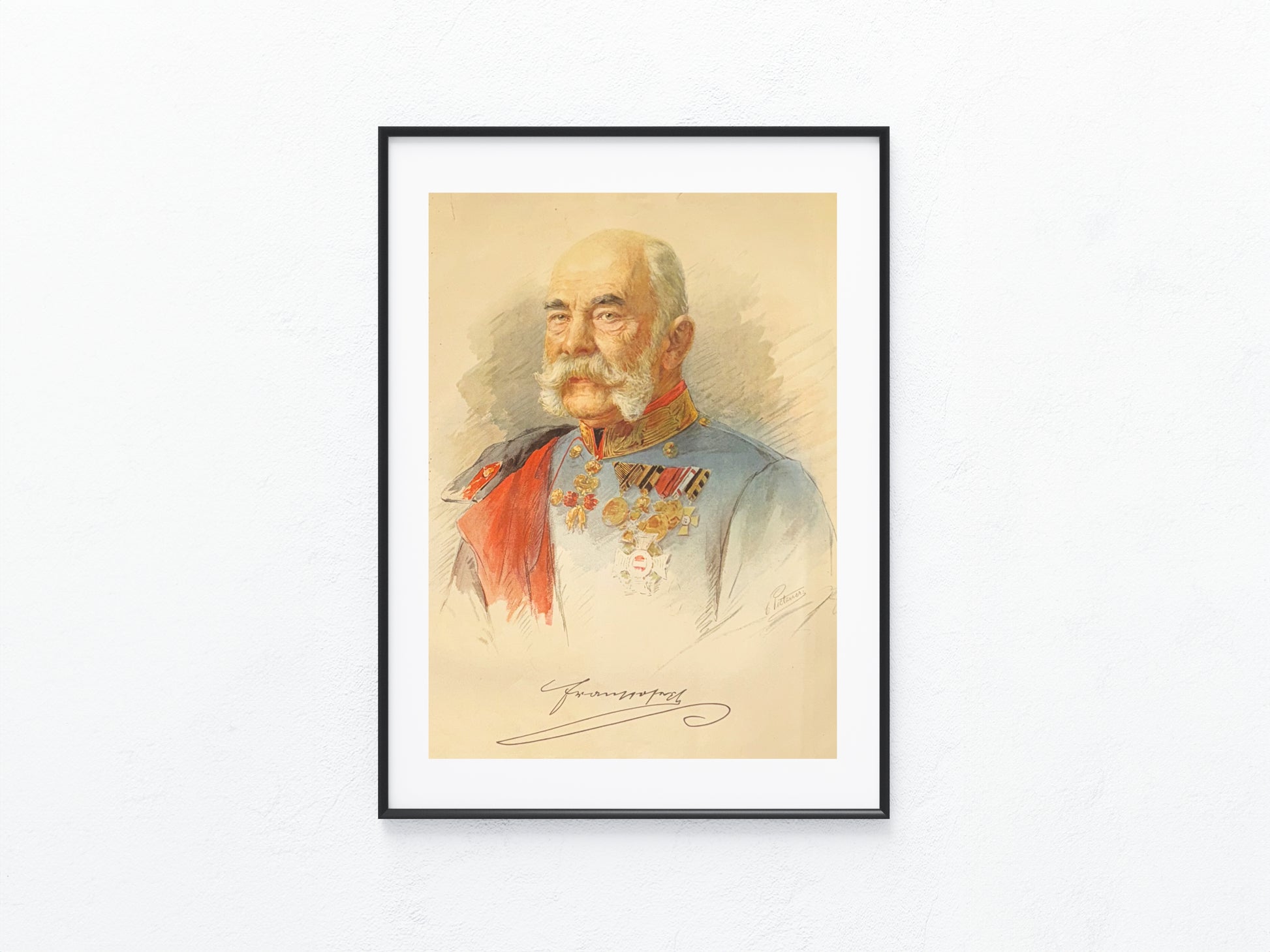 Beeindruckendes Brustbild von Kaiser Franz Joseph I. in Paradeuniform, mit Ordensschmuck und charakteristischem Schnurrbart dargestellt. Die farbige Lithografie stammt aus der Zeit der späten Monarchie und zeigt den greisen Kaiser als Symbolfigur Österreich-Ungarns. Unterhalb findet sich seine gedruckte Faksimile-Signatur. Ein ausdrucksstarkes Zeitdokument für Sammler von Habsburg- und Monarchie-Darstellungen.
