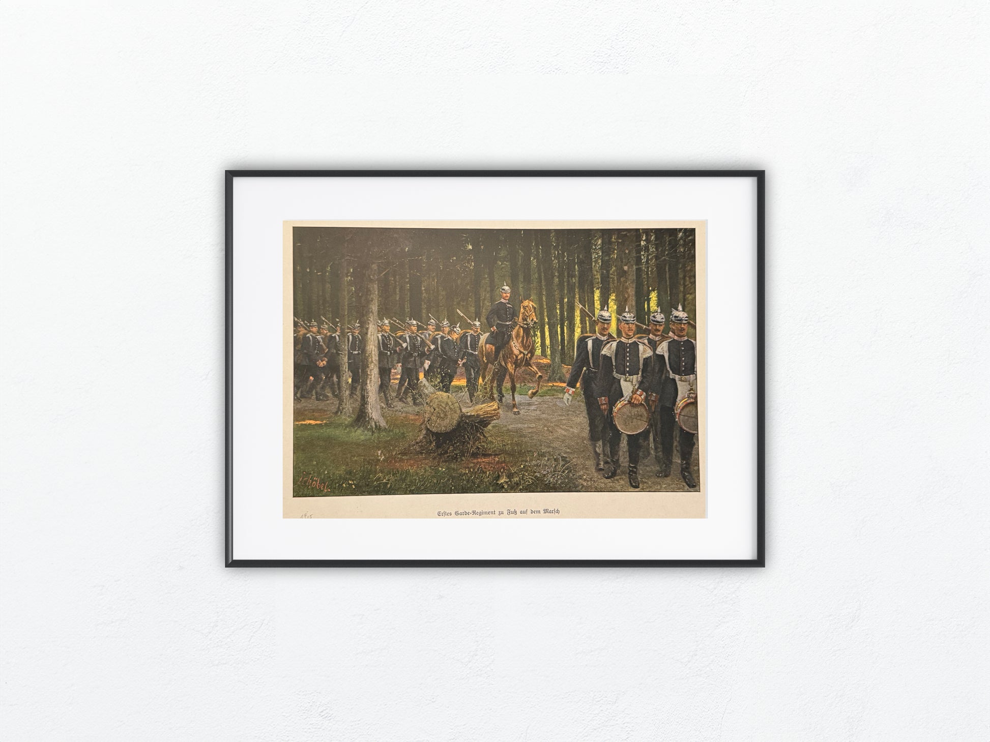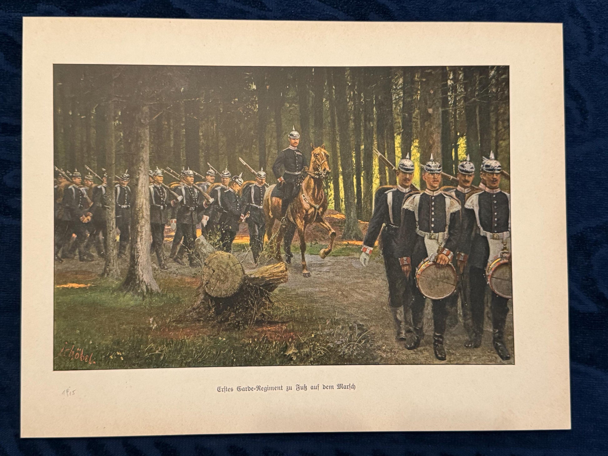 Farbig gedruckte Darstellung des „1. Garde-Regiments zu Fuß“ auf dem Marsch durch einen lichten Wald. Die Szene zeigt eine Formation preußischer Soldaten in Pickelhauben, angeführt von einem Offizier zu Pferd. Im Vordergrund marschiert das Trommlerkorps. Das Motiv stammt vermutlich aus einer illustrierten Zeitschrift um 1915 und ist unten links signiert mit „E. Chobel“.