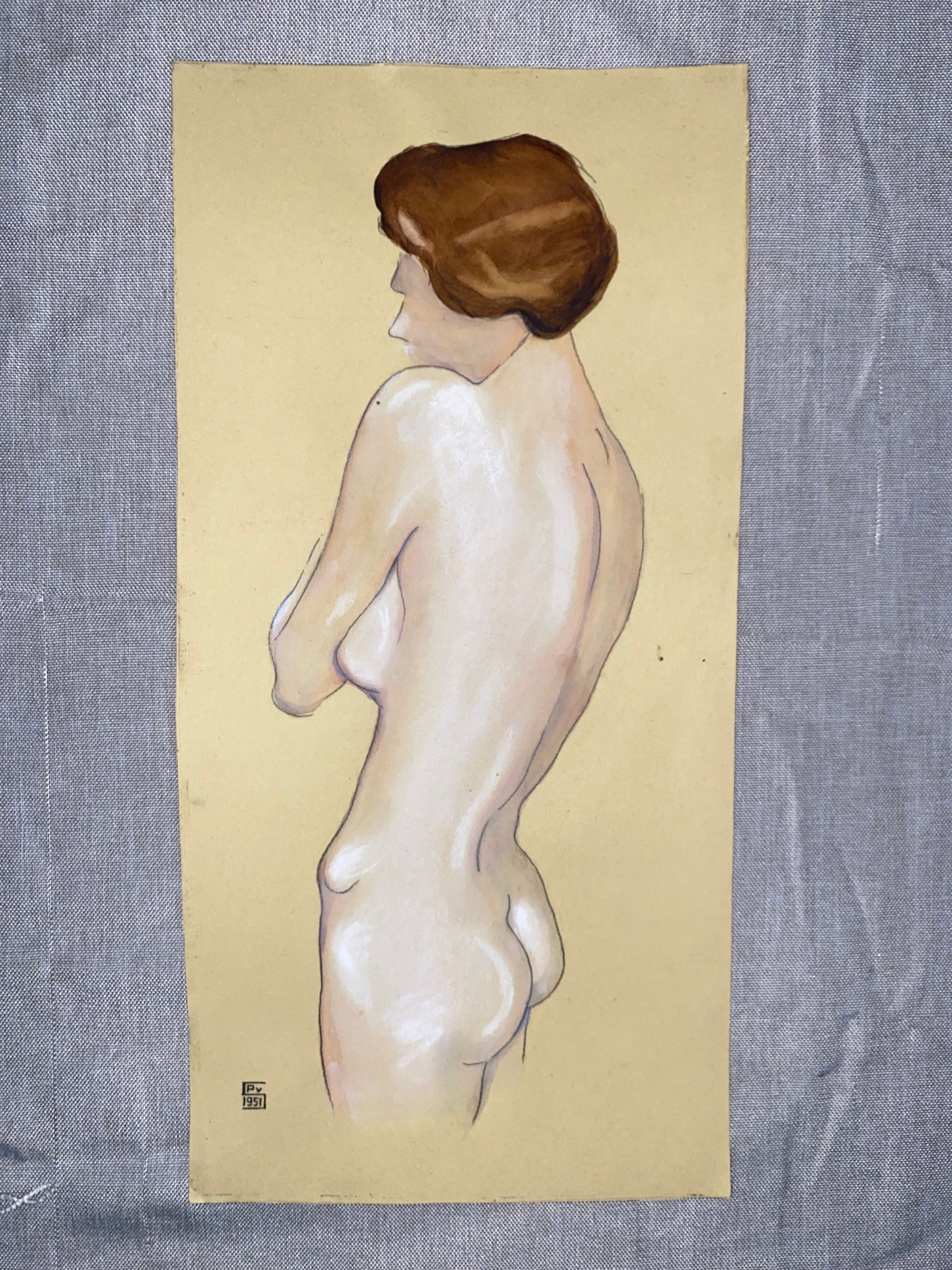 Fein ausgeführte Original-Aktdarstellung einer stehenden Frau im Profil von hinten, datiert 1951. Die Arbeit zeigt eine elegante, naturalistische Malweise mit Betonung der Körperformen und der Licht-Schatten-Wirkung auf hellem Hintergrund. Unten links mit Signatur/Monogramm „Pv 1951“ versehen.