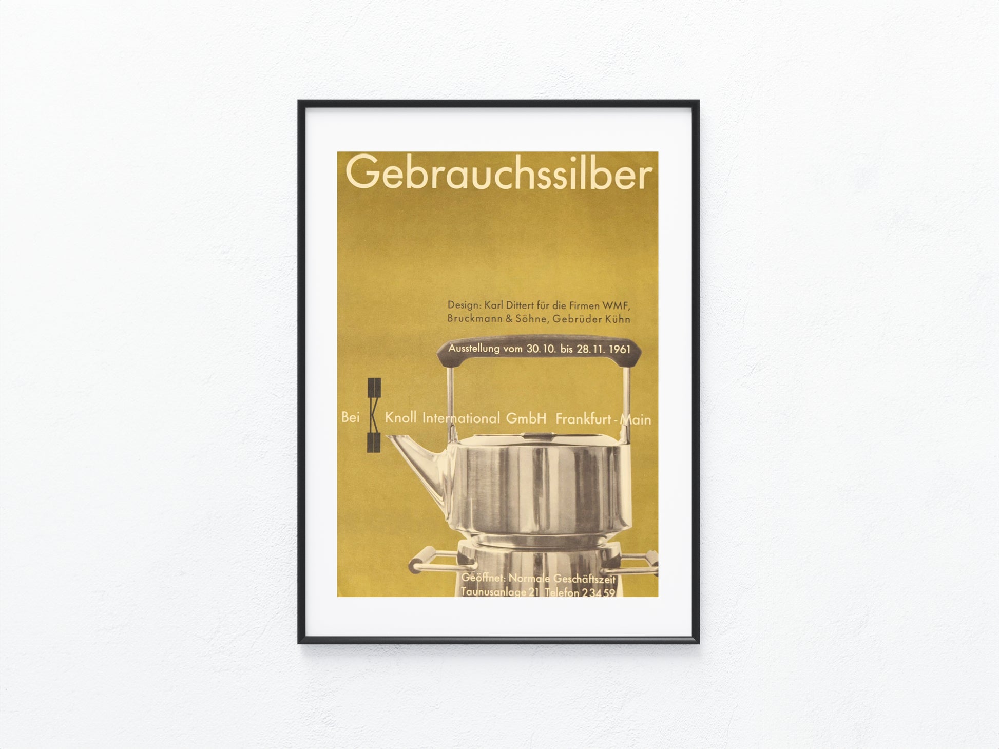 Seltenes Ausstellungsplakat „Gebrauchssilber“ von 1961, gestaltet von Karl Dittert für die renommierten Silberwarenhersteller WMF, Bruckmann & Söhne und Gebrüder Kühn. Präsentiert wurde die Schau vom 30.10. bis 28.11.1961 bei Knoll International GmbH in Frankfurt am Main.