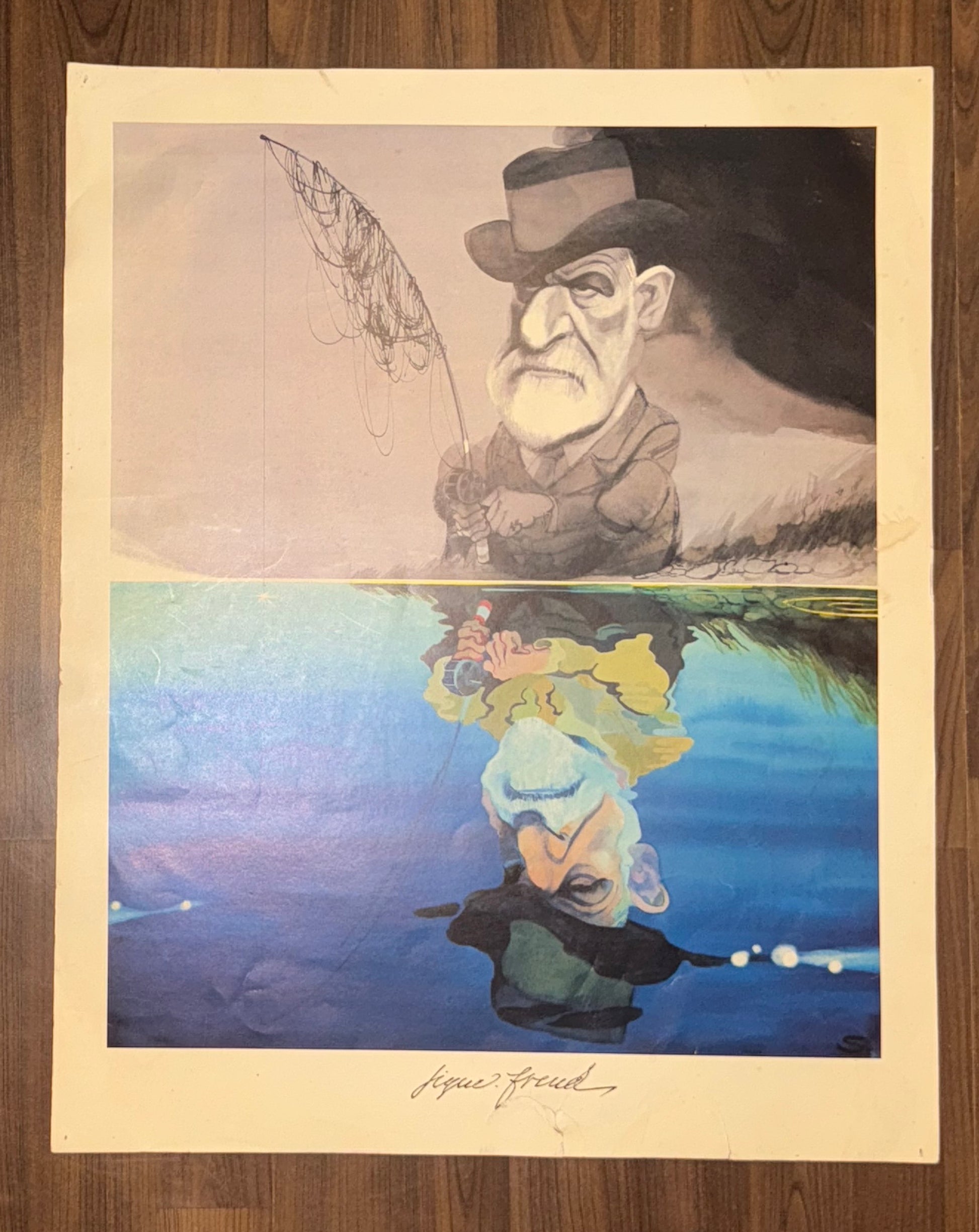 Origineller Kunstdruck mit Karikatur von Sigmund Freud, dem Begründer der Psychoanalyse. Das Bild zeigt Freud mit Hut und Angel, dessen Spiegelung eine zweite, verfremdete Darstellung ergibt – eine spielerische Anspielung auf das Unbewusste und die Doppelbödigkeit der menschlichen Wahrnehmung. Auffällige Farbgebung kombiniert mit einer kontrastreichen Schwarz-Weiß-Spiegelung machen dieses Blatt zu einem außergewöhnlichen Sammlerstück.
