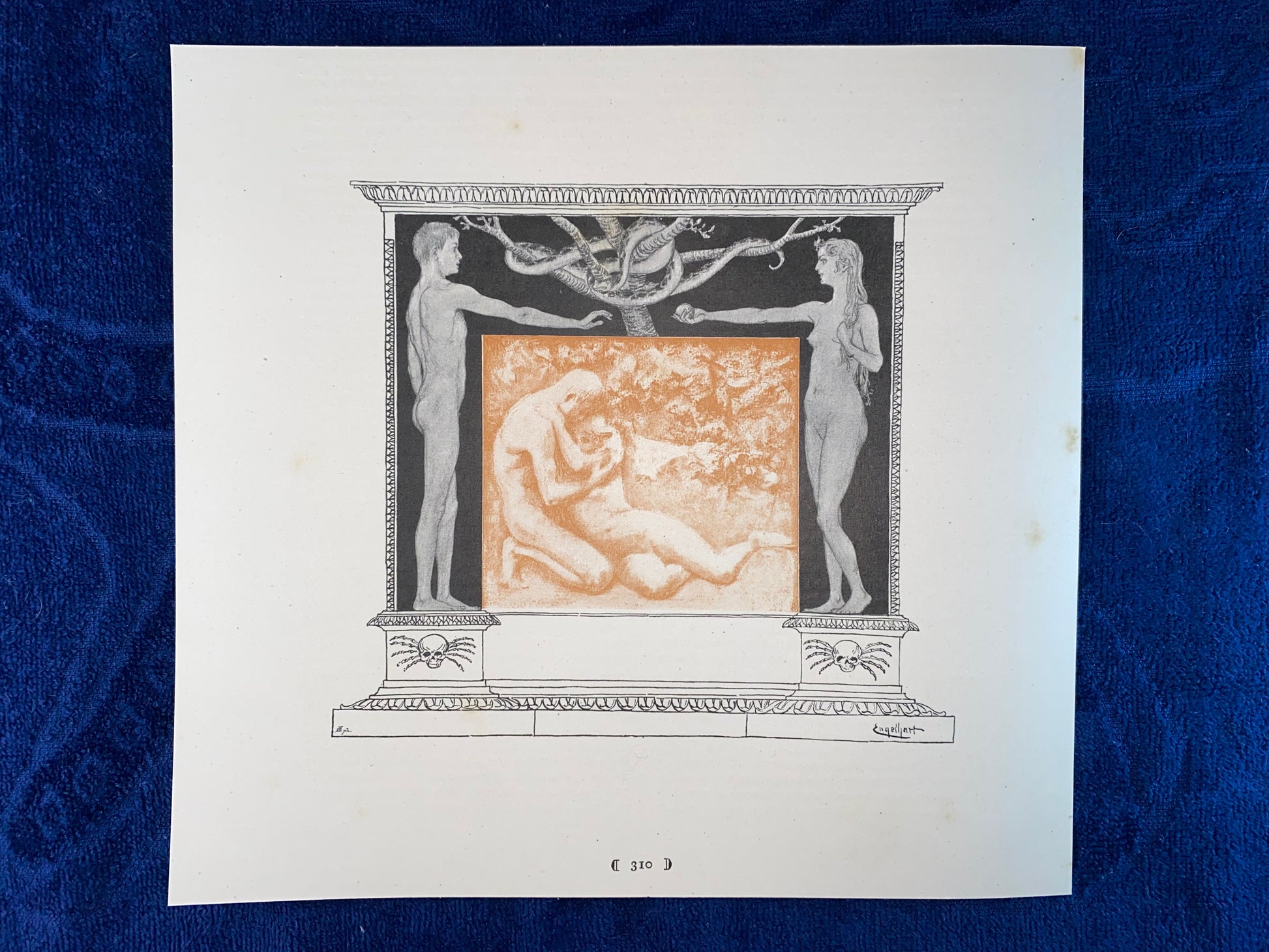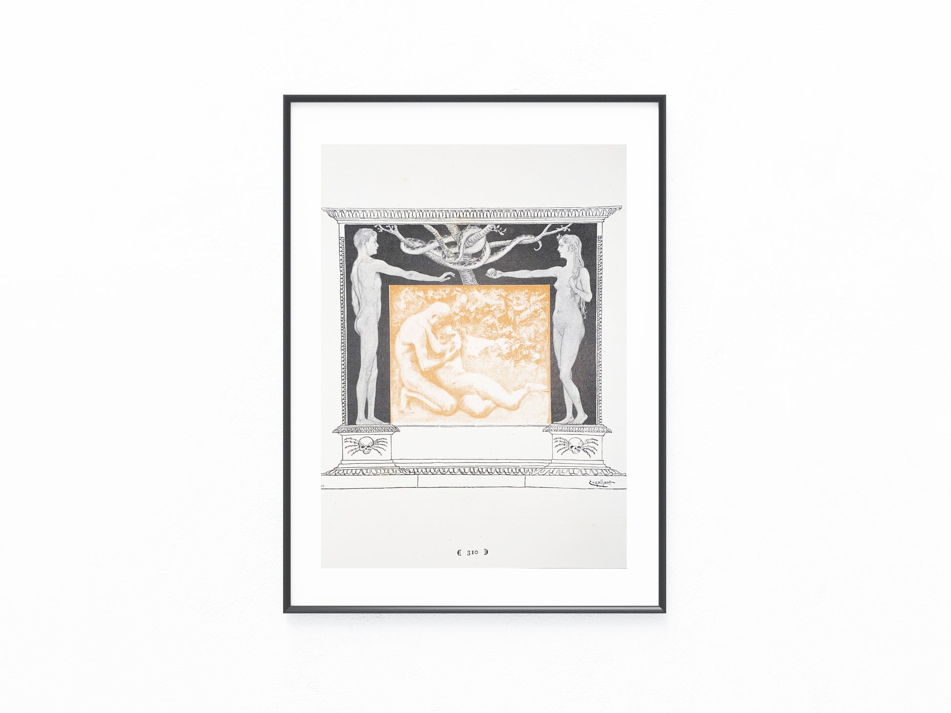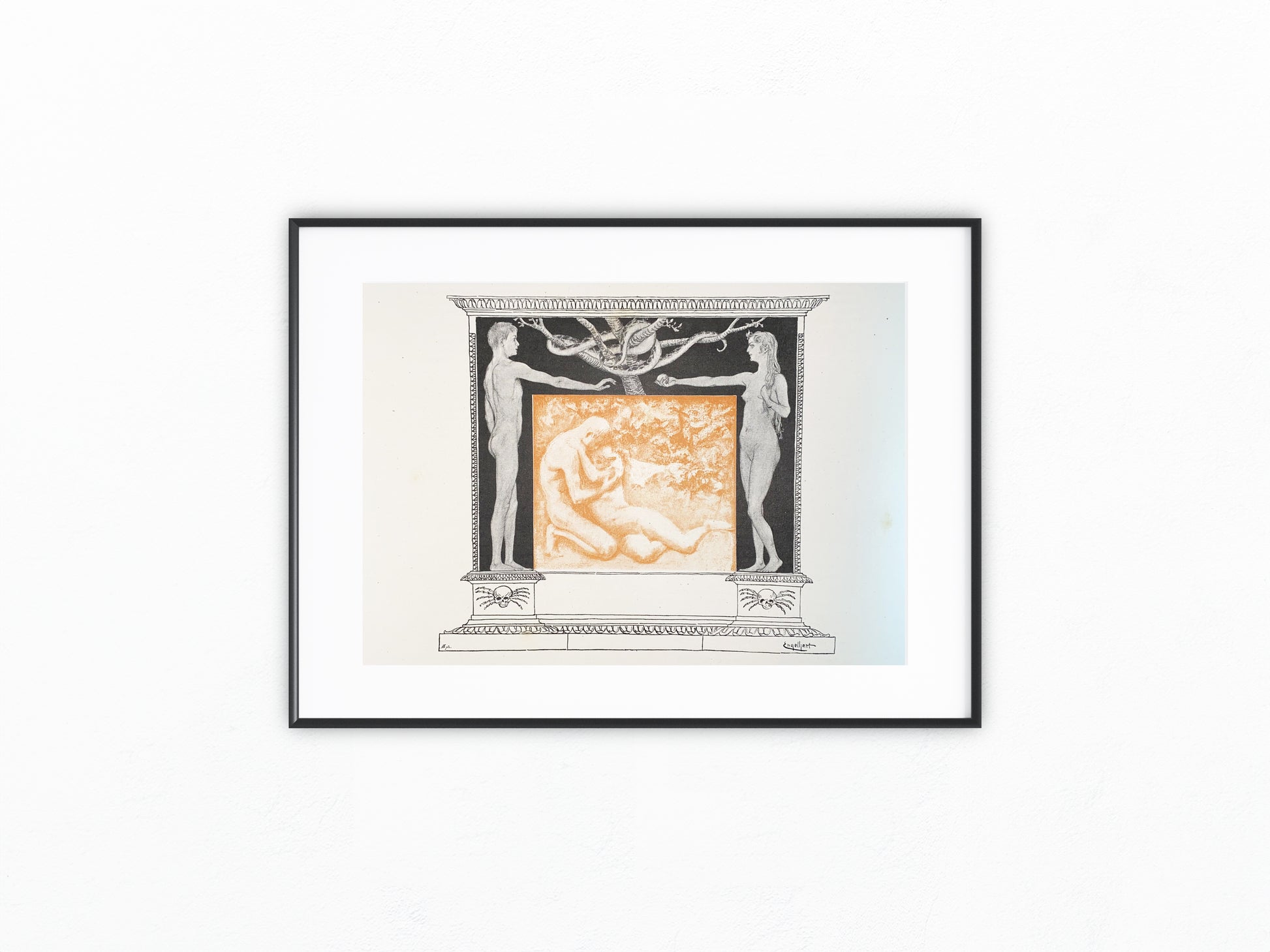 Adam & Eva Jugendstildruck 1900 | Mythologische Szene mit Akten und Ornamentrahmen