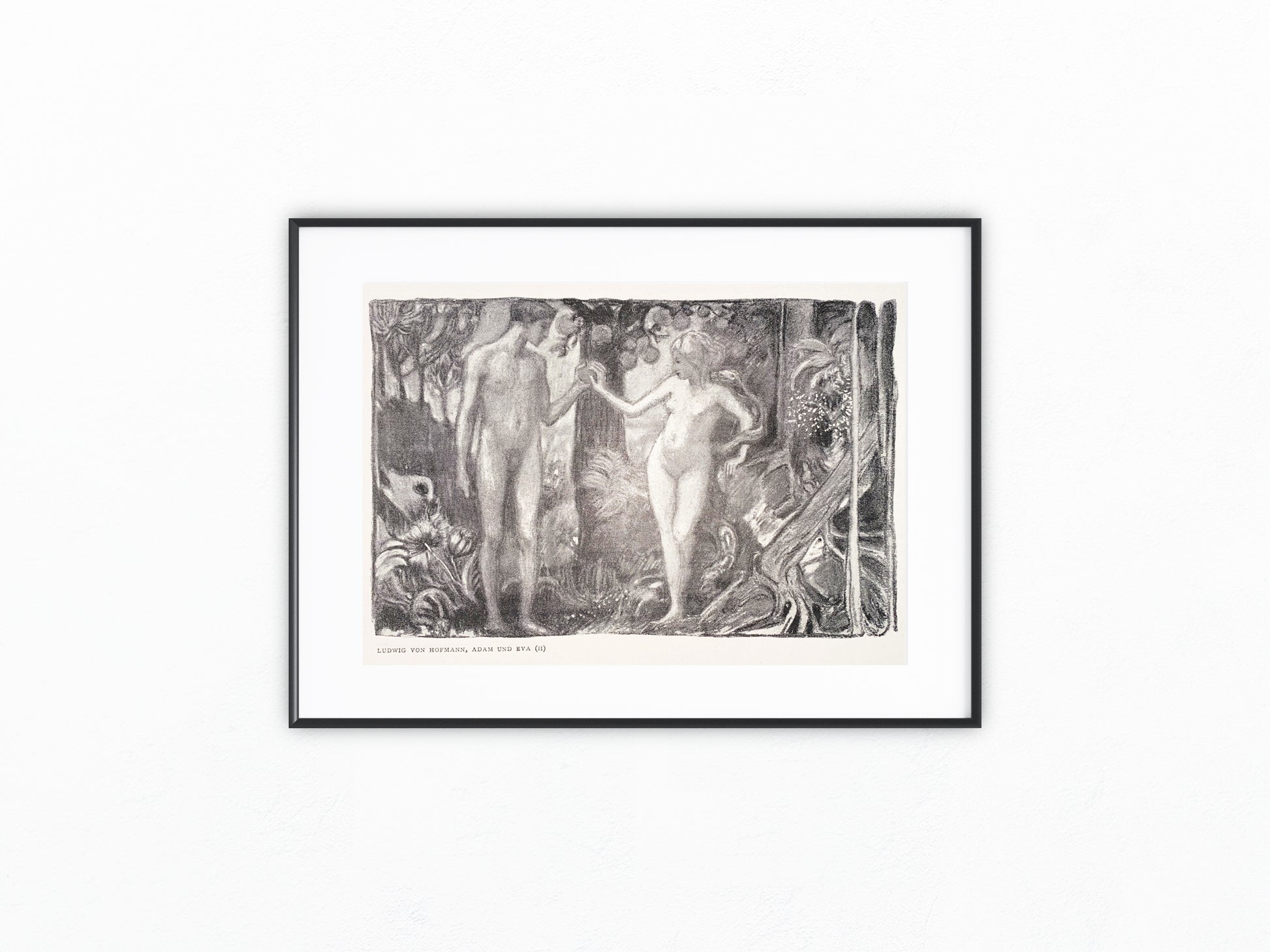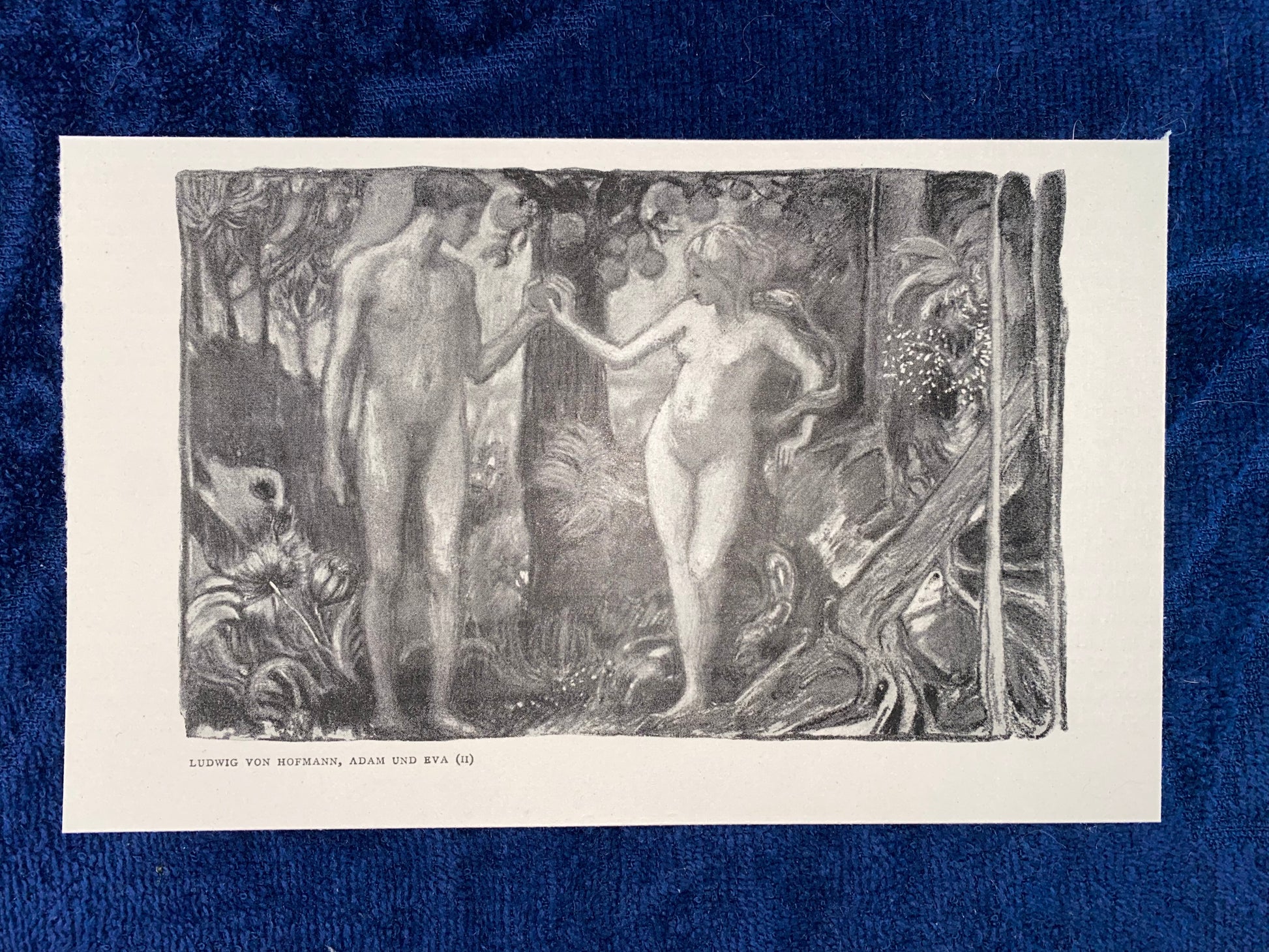 Dekorativer Jugendstildruck nach Ludwig von Hofmann (1861–1945), entstanden um 1900. Das Motiv „Adam und Eva (II)“ zeigt die beiden biblischen Figuren nackt im Paradies, umgeben von dichter Vegetation. Die ornamentale Linienführung und die symbolische Bildsprache machen dieses Blatt zu einem eindrucksvollen Beispiel der Jugendstilkunst mit religiöser Thematik.