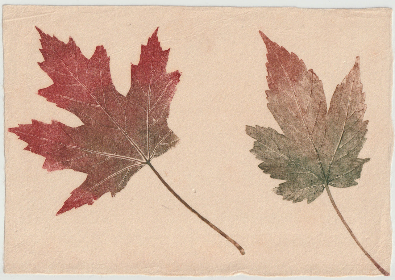 Dieser farblich reizvolle Naturselbstdruck zeigt zwei nebeneinander angeordnete Ahornblätter in kontrastierenden Farbtönen: links in kräftigem Rotbraun, rechts in gedecktem Grün mit rötlichen Spitzen. Die feine Darstellung der Blattadern und -ränder zeugt vom klassischen Verfahren des Selbstdrucks mit echtem Blattmaterial.