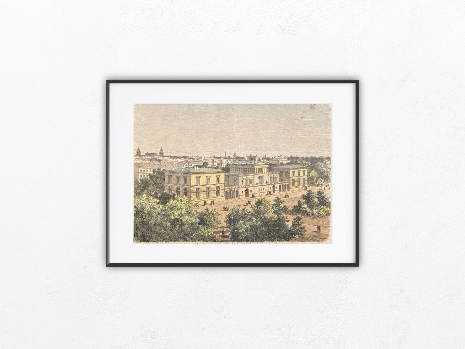 Fein kolorierte Original-Lithografie mit Blick auf das Berliner Kronprinzenpalais und das Königliche Palais an der prachtvollen Straße „Unter den Linden“, gesehen vom Tiergarten aus. Die Szene zeigt das Berlin des 19. Jahrhunderts mit Reitern, Passanten und Kutschen – eingebettet in ein dekoratives, zeittypisches Passepartout.