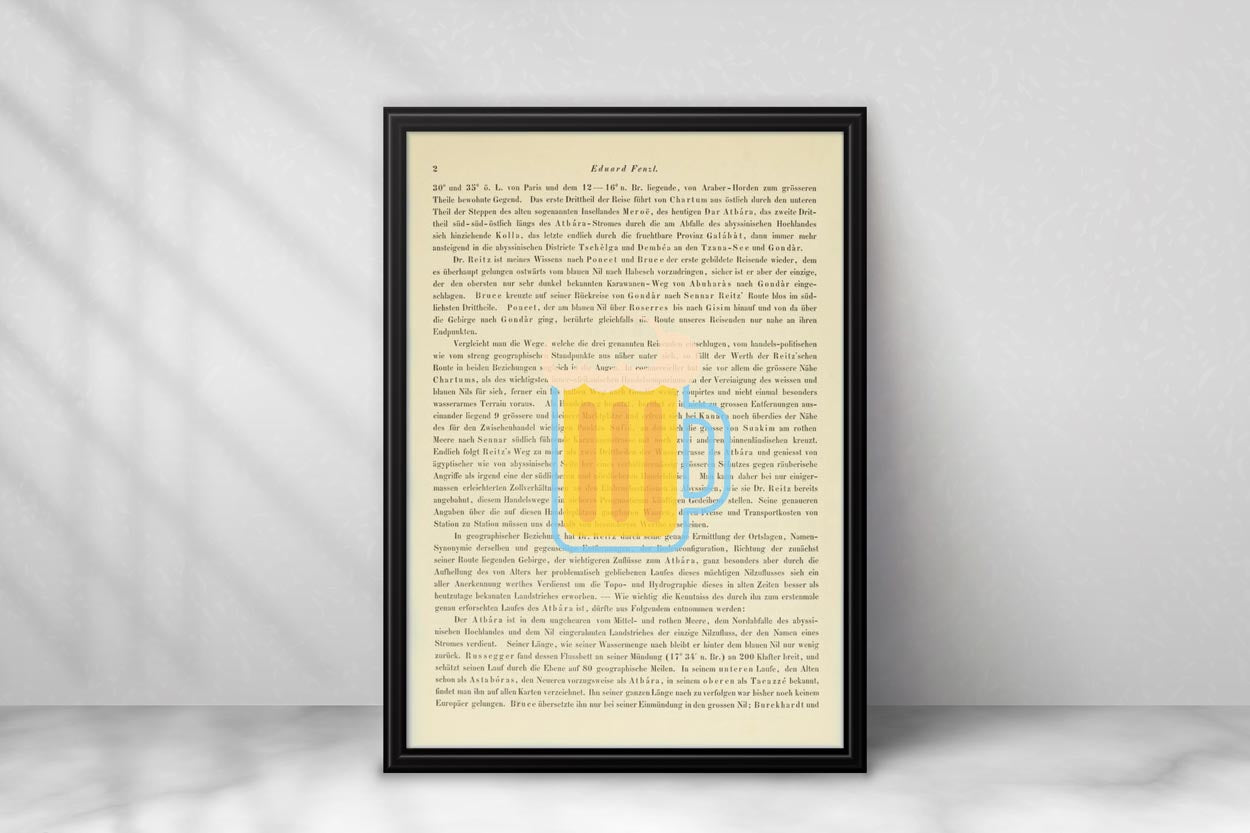 Unsere Drucke sind auf Seiten der Denkschriften der Akademie der Wissenschaften in Wien gefertigt, die über die Jahre eine wunderschöne elfenbeinfarbene Patina entwickelt haben. Mit einem Alter von mindestens 100 Jahren hat jede Seite ihren eigenen einzigartigen Charakter. Jeder Druck erfolgt direkt auf die einzelne Buchseite, sodass kein anderer das gleiche Stück wie du besitzen wird – ein echtes Unikat eben.