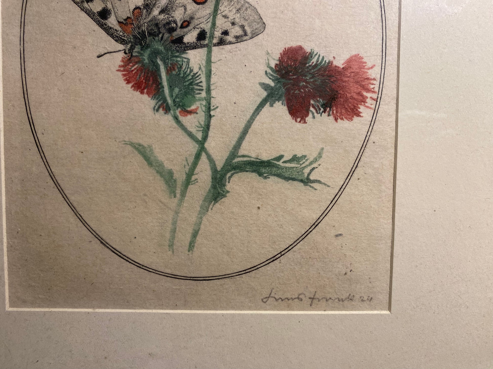 Dieser signierte Druck aus dem Jahr 1924, ist ein wunderbares Beispiel für die Naturkunst der frühen 20er Jahre. Die Grafik, die einen Schmetterling in natürlicher Umgebung auf einer Distel zeigt, ist in einem hervorragenden Zustand erhalten. Der Rahmen, der die Grafik umschließt, weist zwar im oberen Teil eine leichte Beschädigung auf – ein kleines abgeschlagenes Stück –, dies mindert jedoch nicht den Gesamteindruck des Kunstwerks. Die Maße von 28 cm x 24 cm machen es zu einem idealen Stück für verschiedene Räumlichkeiten und Sammlungen. Ein reizvolles Sammlerstück für Liebhaber von Naturillustrationen und Kunstwerken aus den 1920er Jahren.