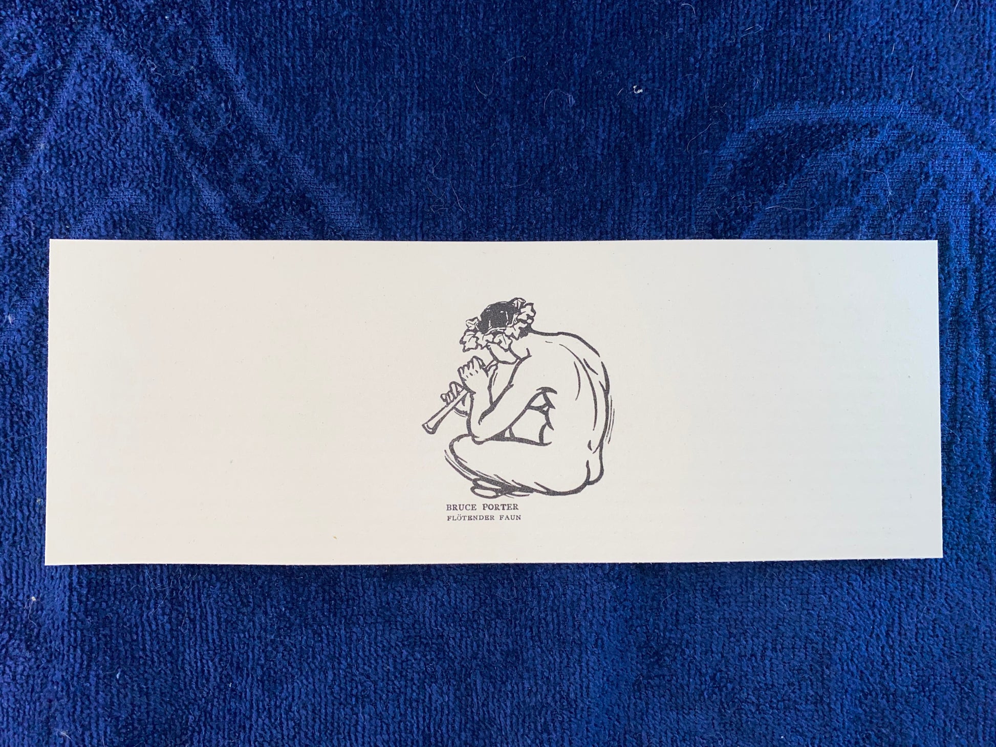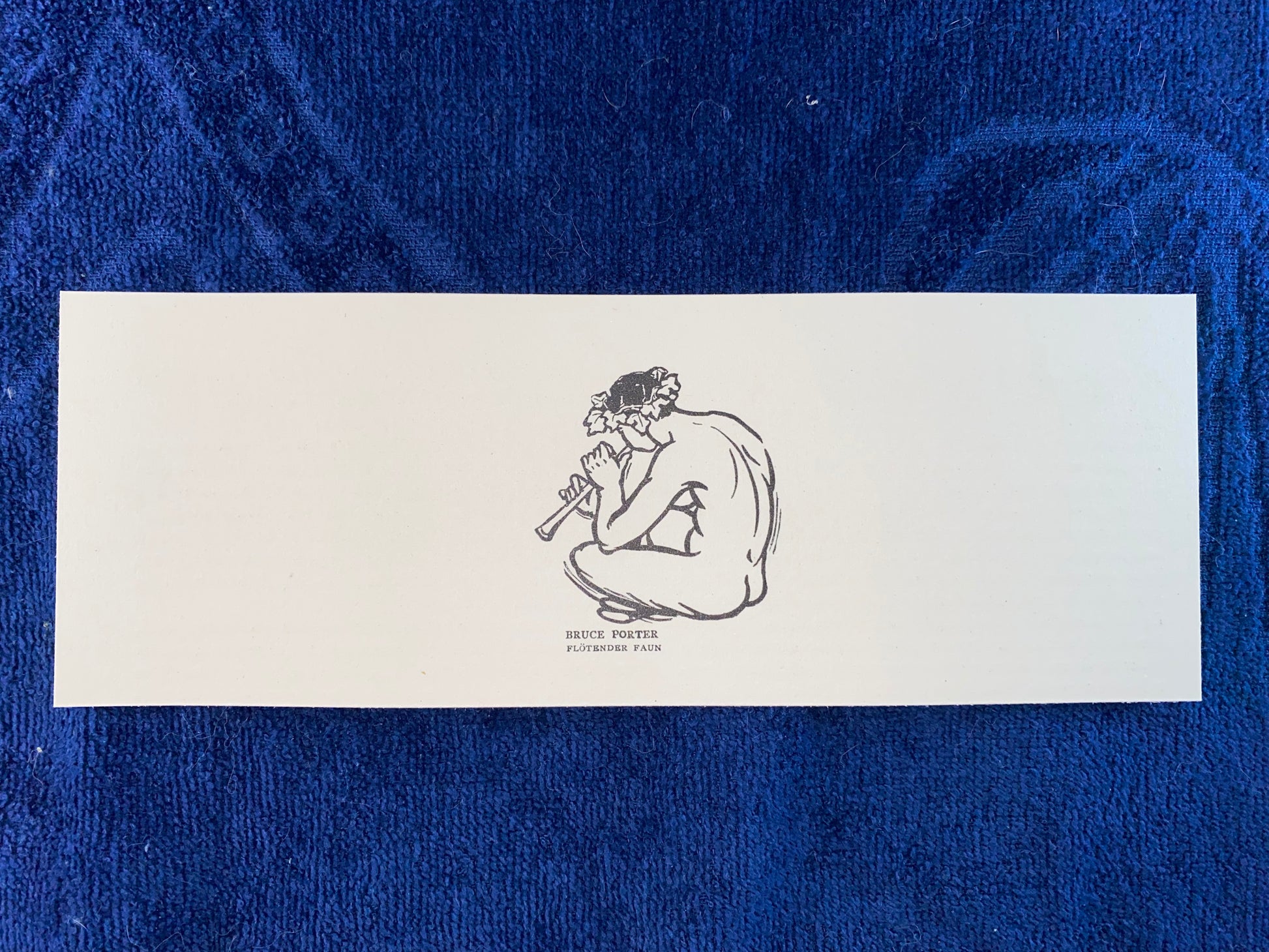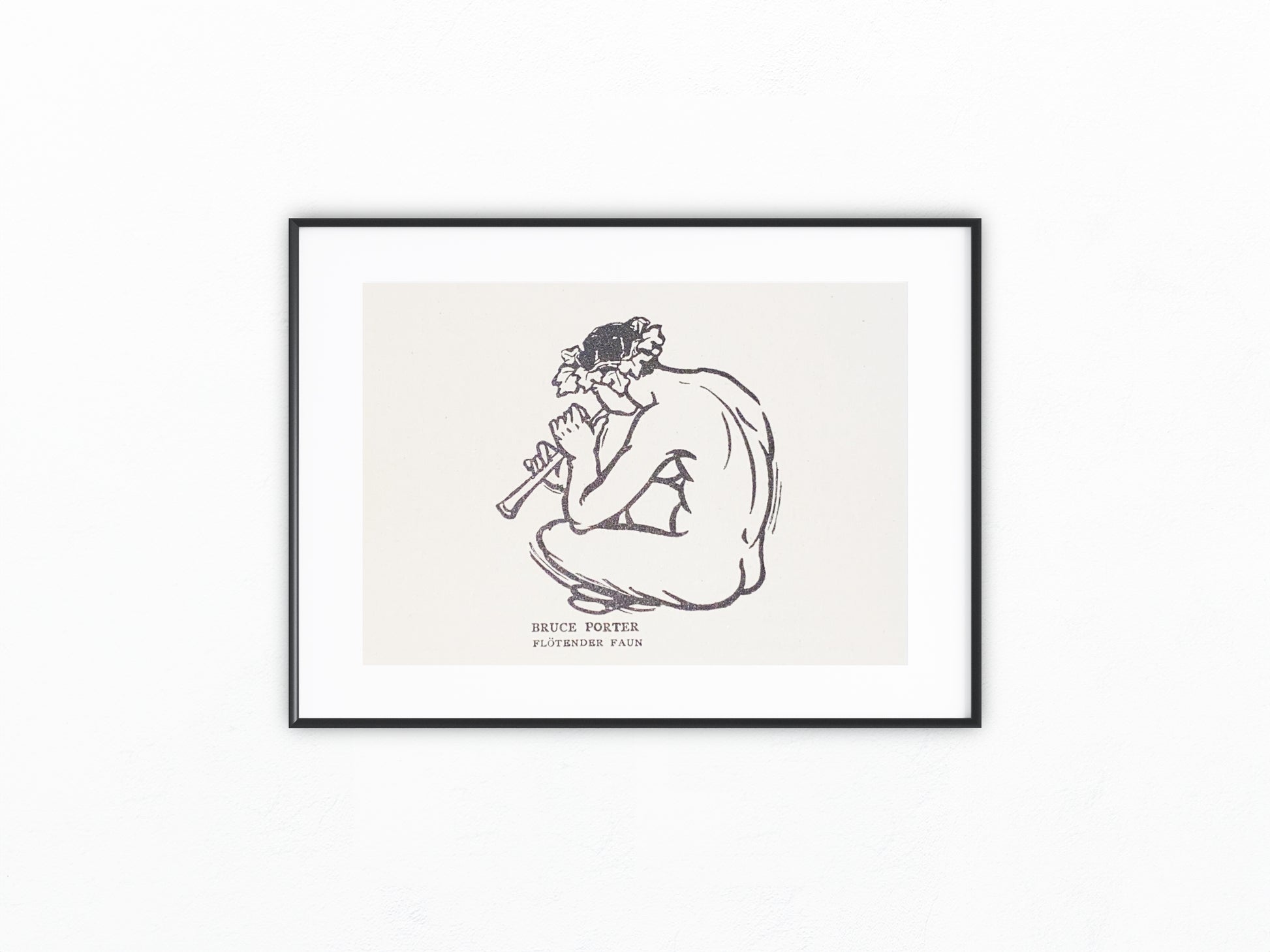 Dekorativer Jugendstildruck von Bruce Porter (1865–1953), entstanden um 1900. Das Motiv zeigt einen sitzenden Faun mit Flöte, in klarer Linienführung und stilisierter Formensprache. Ein feines Beispiel für die mythologischen Themen des Jugendstils, reduziert auf die wesentliche Figur.