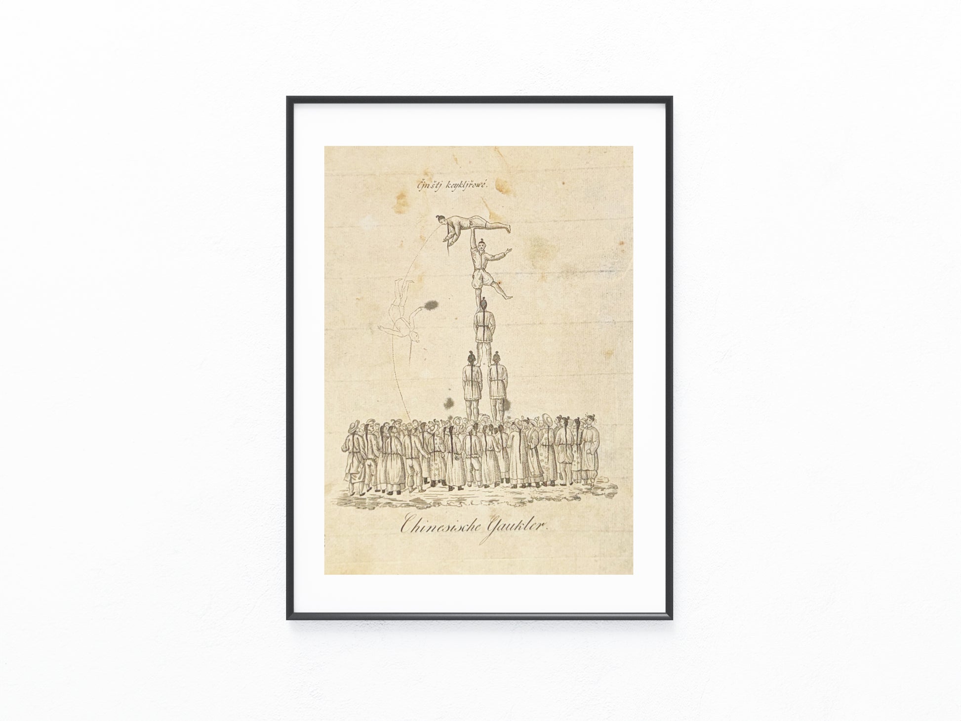Feine ethnografische Illustration aus dem Jahr 1834 mit der Darstellung chinesischer Gaukler bei einer akrobatischen Vorführung. Zu sehen ist ein artistischer Turm aus balancierenden Männern – umringt von einer dicht gedrängten Zuschauergruppe. Der Kupferstich ist mit deutschem und tschechischem Titel versehen (Chinesische Gaukler / Čínští kejklířové).