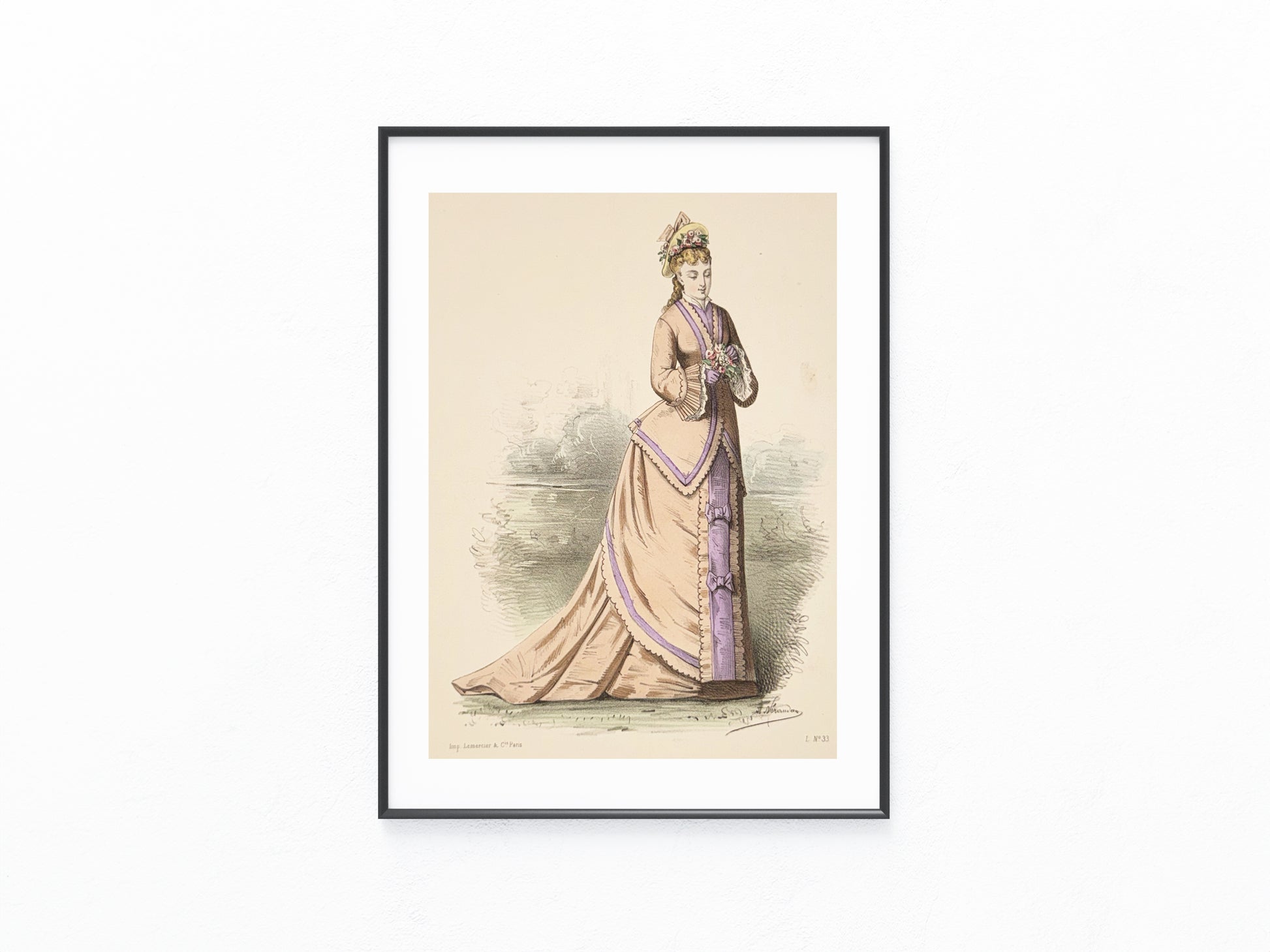 Fein altcoloriertes Modeblatt aus der französischen Zeitschrift Le Moniteur de la Mode, Blatt Nr. 17, um 1870. Dargestellt ist eine Dame in einer apricotfarbenen Robe mit lila Schleifen, langer Schleppe und passender Haube mit Blütenschmuck. Im Hintergrund ist eine stilisierte Gartenkulisse angedeutet. Die klare Linienführung und die sanften Farben machen diese Illustration besonders dekorativ.