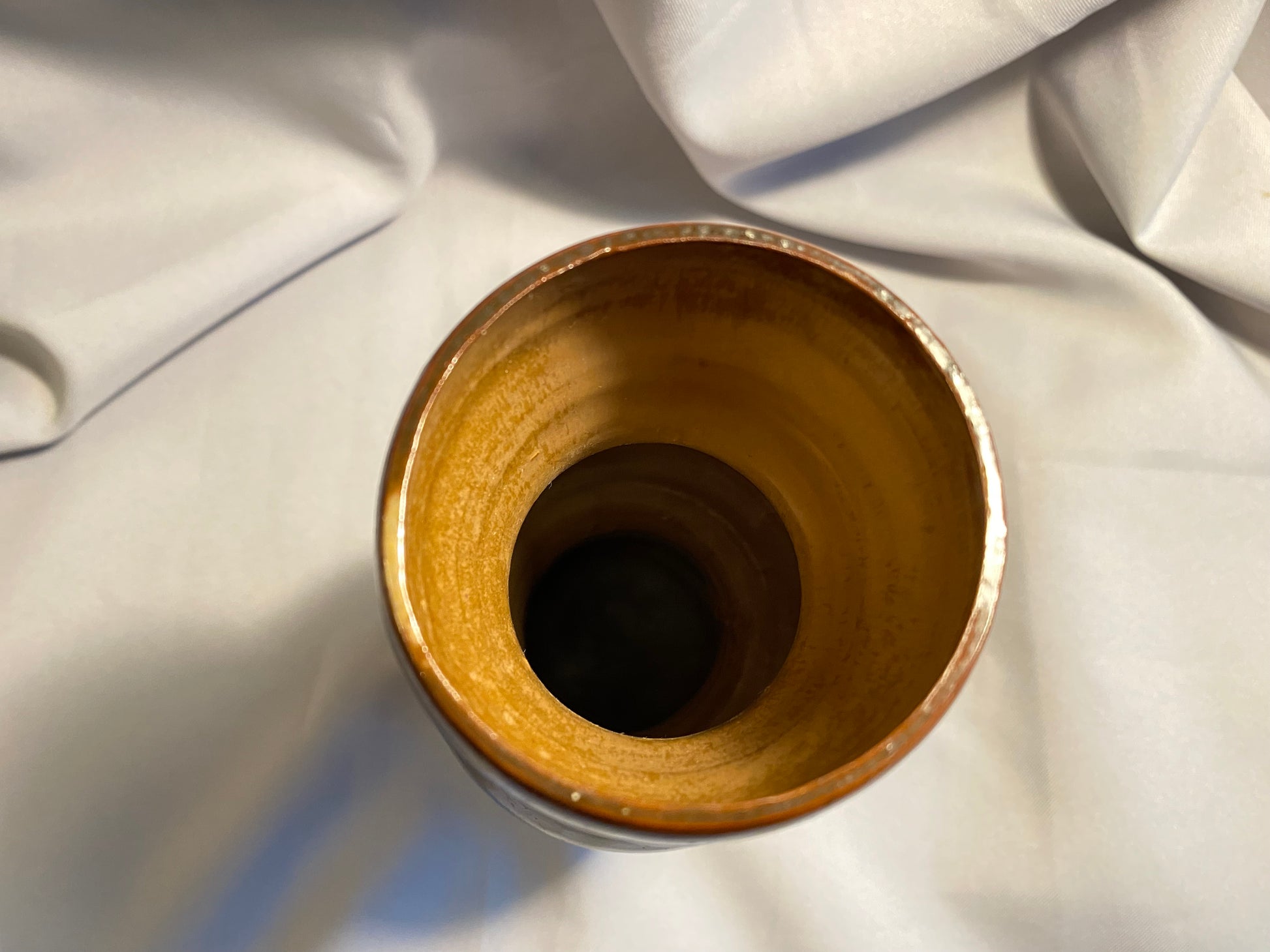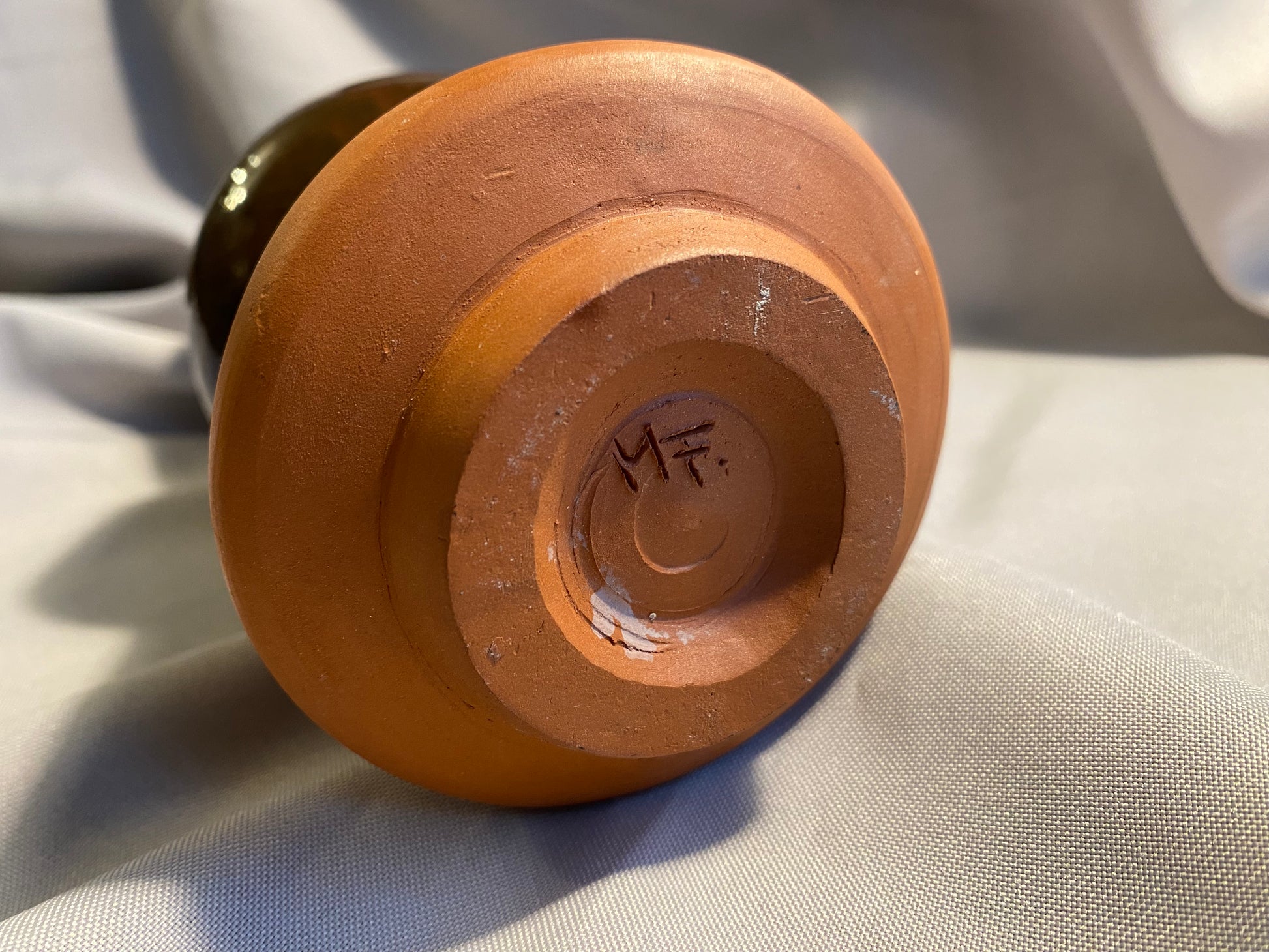 Diese dekorative Vase aus Ton stammt aus den 1960er Jahren und fügt sich durch ihr zeitloses Design in jede Umgebung ein. Der obere Teil der Vase ist in einem ansprechenden Braunton lackiert, der harmonisch mit der natürlichen Farbe des Tons zusammenwirkt. Ein einzelner Tropfen-Akzent verleiht der Vase eine besondere Note. Auf der Unterseite ist die Vase mit „MF.“ markiert, was auf ihre Herkunft bzw. den Künstler hinweist. Mit einer Höhe von 21 cm und einer Breite von ungefähr 8,5 cm ist sie von angenehmer Größe und bietet sich ideal zur Präsentation von Blumensträußen oder als eigenständiges Kunstobjekt an. Diese Tonvase ist nicht nur ein funktionales Gefäß, sondern auch ein stilvolles Dekorationselement.