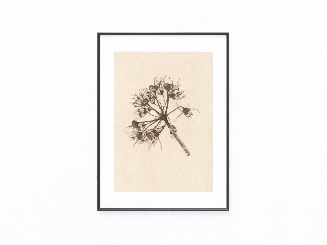 Dieser kleinformatige Naturselbstdruck zeigt einen fein ausgearbeiteten Doldenblütler in gestochen scharfer Ausführung und dunklem Farbton. Die filigranen Stiele, zarten Knospen und feinen Fruchtstände wirken wie gezeichnet – ein eindrucksvolles Beispiel botanischer Druckkunst auf kleinem Raum.