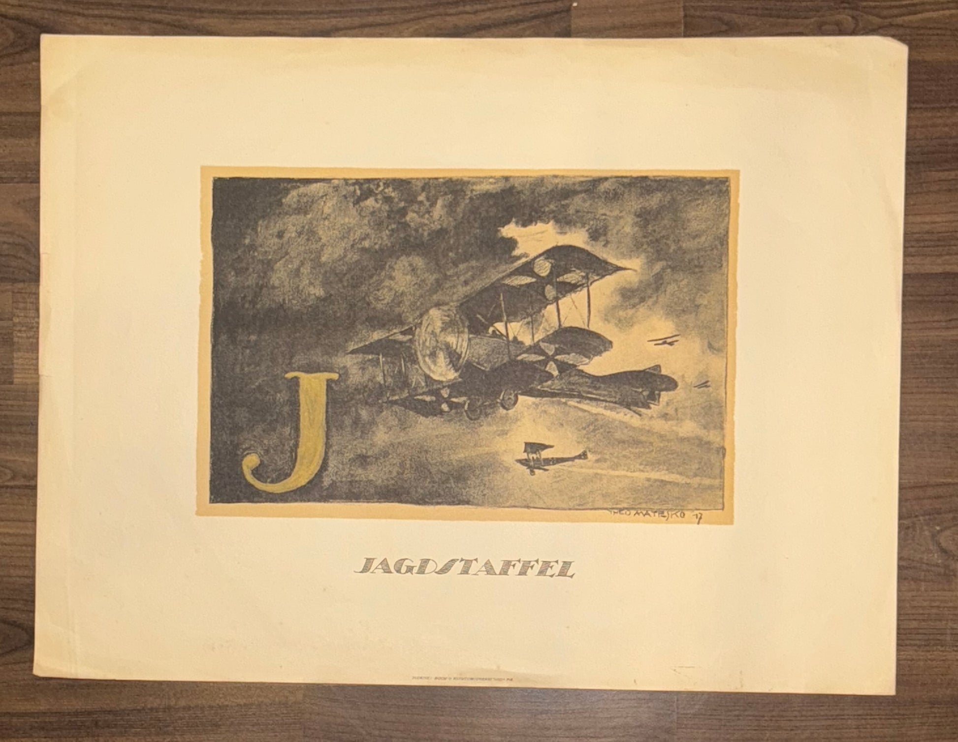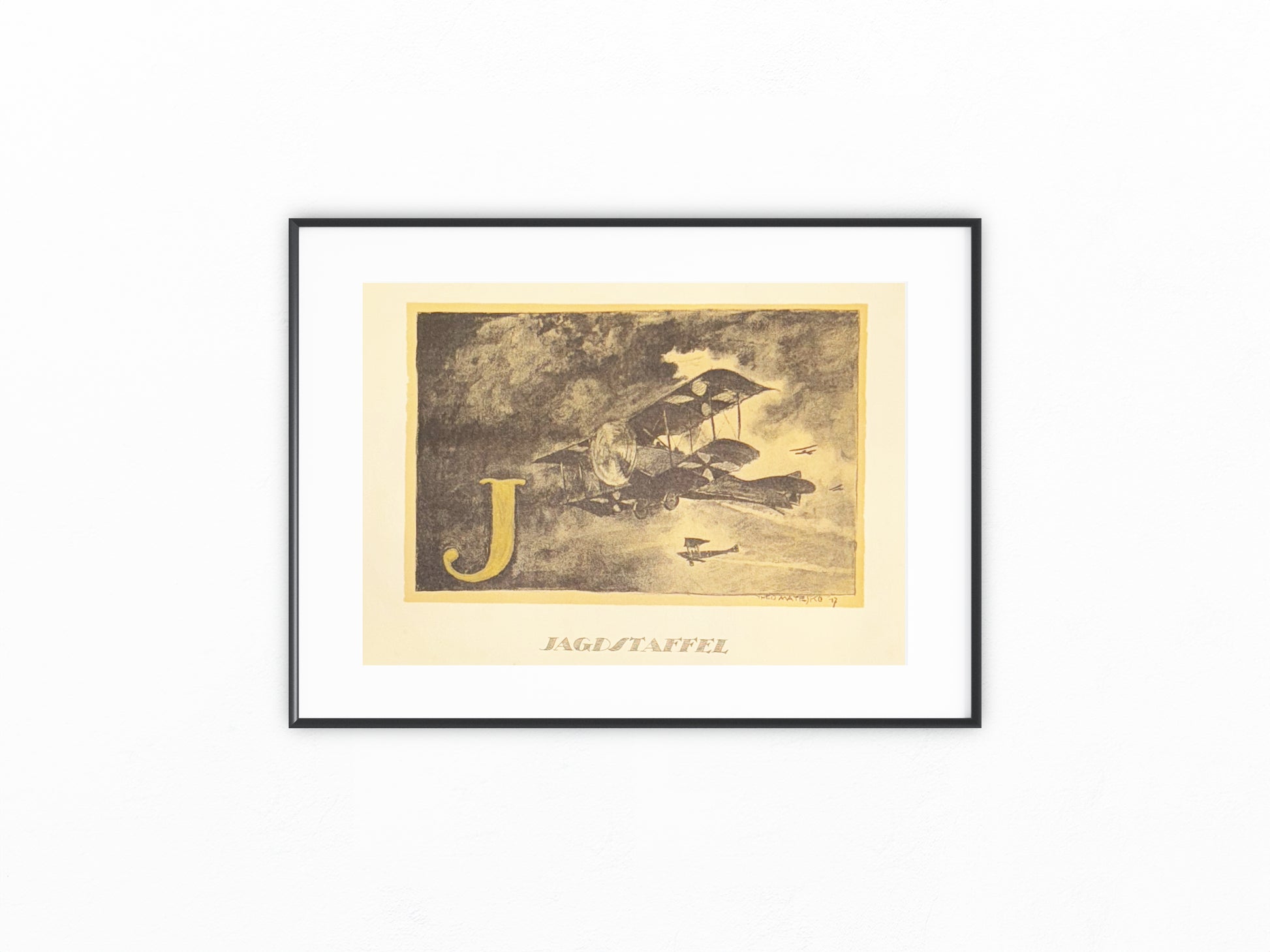 Seltene Lithografie mit dem Titel „Jagdstaffel“, entstanden um 1920. Das dramatische Blatt zeigt deutsche Doppeldecker im Luftkampf, umgeben von Wolken und feindlichen Maschinen. Obwohl einige Jahre nach Kriegsende gedruckt, spiegelt es die Bildsprache und das Erleben der Luftkämpfe des Ersten Weltkriegs eindrucksvoll wider und steht zugleich als Beispiel für die militärische Propagandakunst der frühen 1920er Jahre.