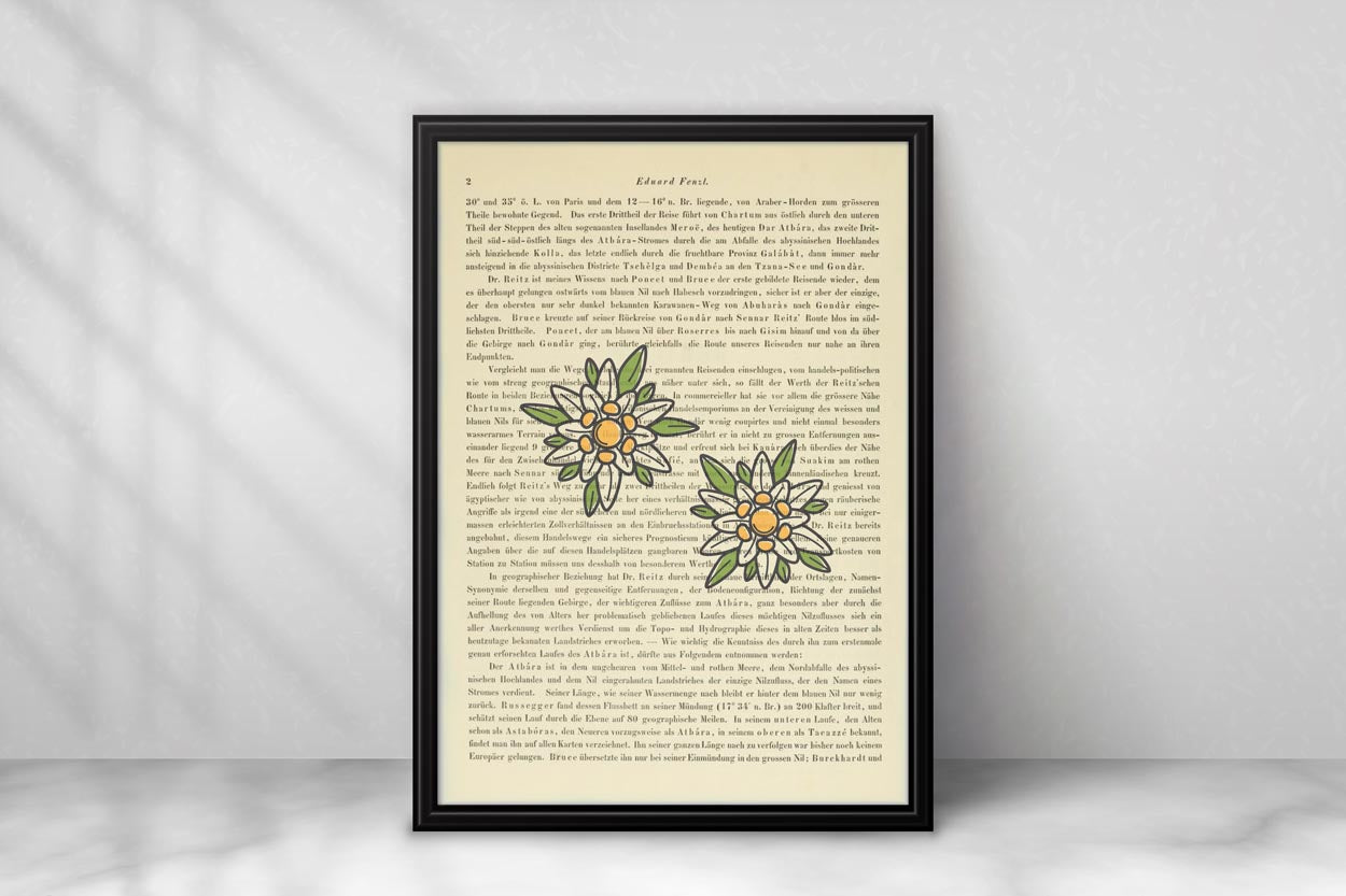 Unsere Drucke sind auf Seiten der Denkschriften der Akademie der Wissenschaften in Wien gefertigt, die über die Jahre eine wunderschöne elfenbeinfarbene Patina entwickelt haben. Mit einem Alter von mindestens 100 Jahren hat jede Seite ihren eigenen einzigartigen Charakter. Jeder Druck erfolgt direkt auf die einzelne Buchseite, sodass kein anderer das gleiche Stück wie du besitzen wird – ein echtes Unikat eben.