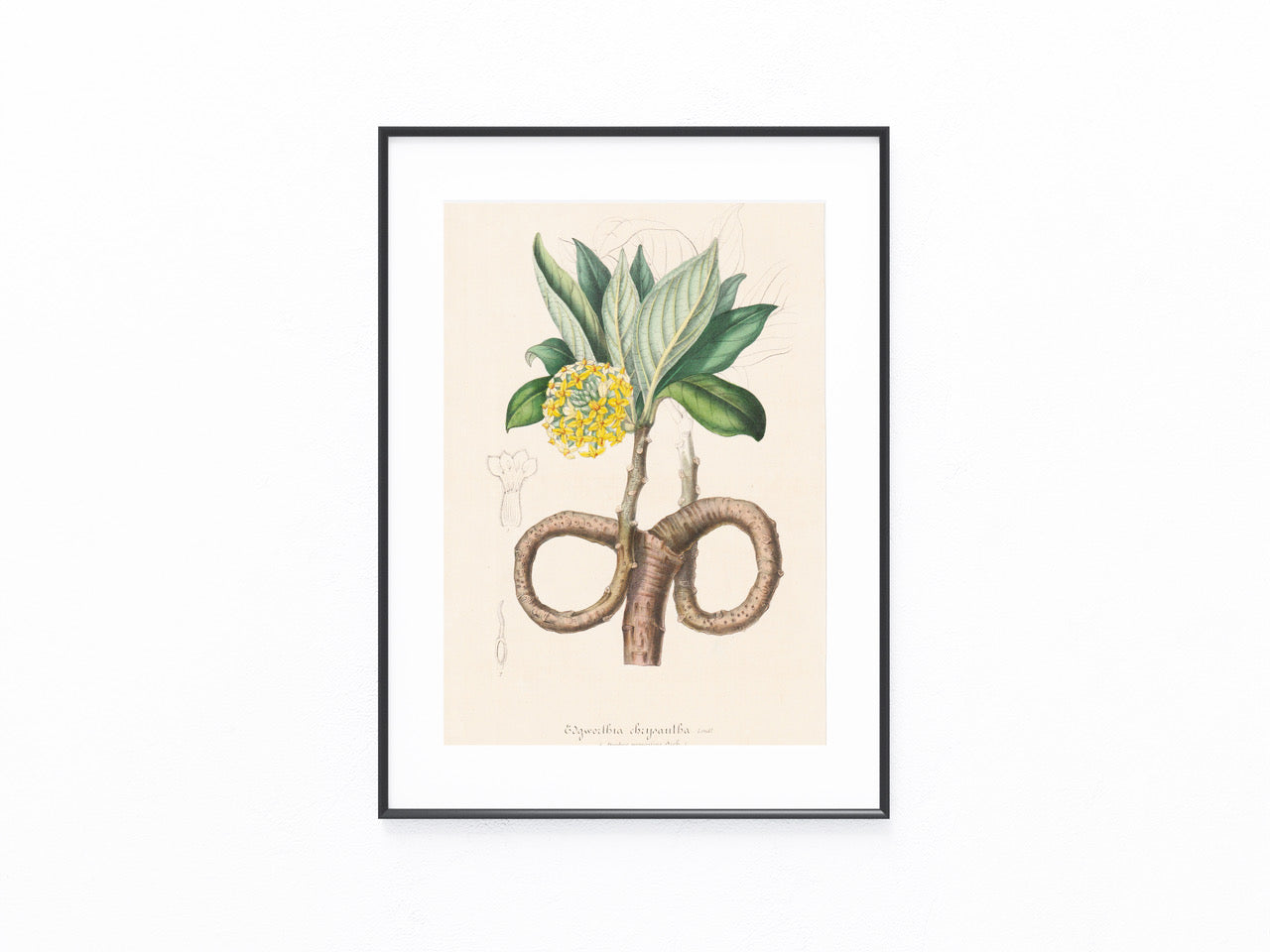 Diese fein kolorierte Lithografie zeigt die selten dargestellte Pflanze Edgeworthia chrysantha Lindl., auch bekannt als Papierstrauch (Daphne papyrifera) – eine asiatische Zier- und Nutzpflanze mit leuchtend gelben, kugelförmigen Blütenständen und auffällig geädertem, lanzettlichem Laub.