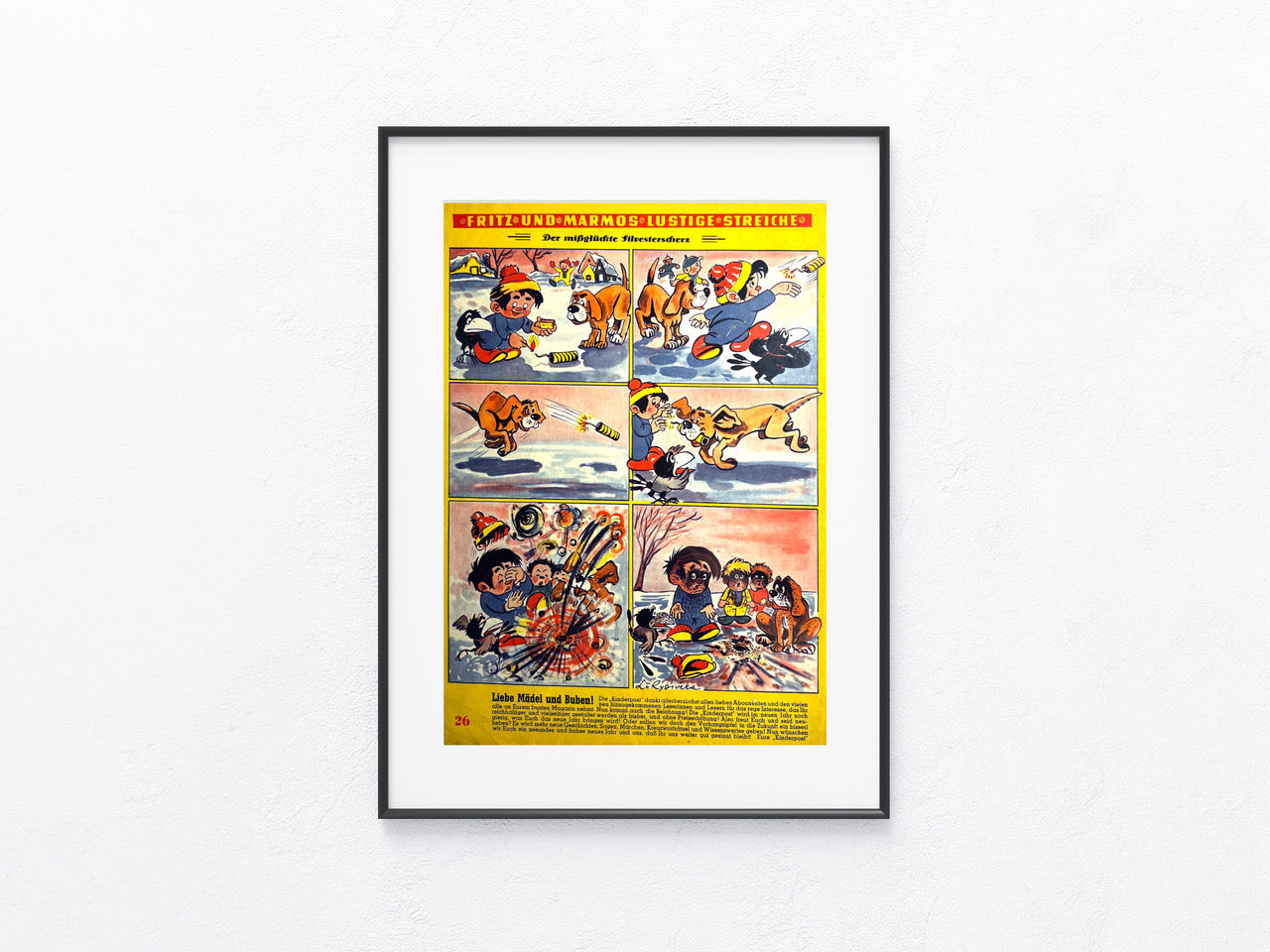 Diese einzigartige Comicseite aus den 1950er Jahren ist ein zeitloses Schmuckstück und eine lebhafte Erinnerung an die goldene Ära der Comics. Die Patina verleiht ihr einen Hauch von Nostalgie und Authentizität, perfekt für alle, die einen Hauch von Retro-Charme in ihrem Zuhause schätzen. Als einzigartiges Original und kein bloßer Nachdruck ist sie ein unverzichtbares Juwel für Comic-Enthusiast*innen und eine stilvolle Bereicherung für jede Sammlung.