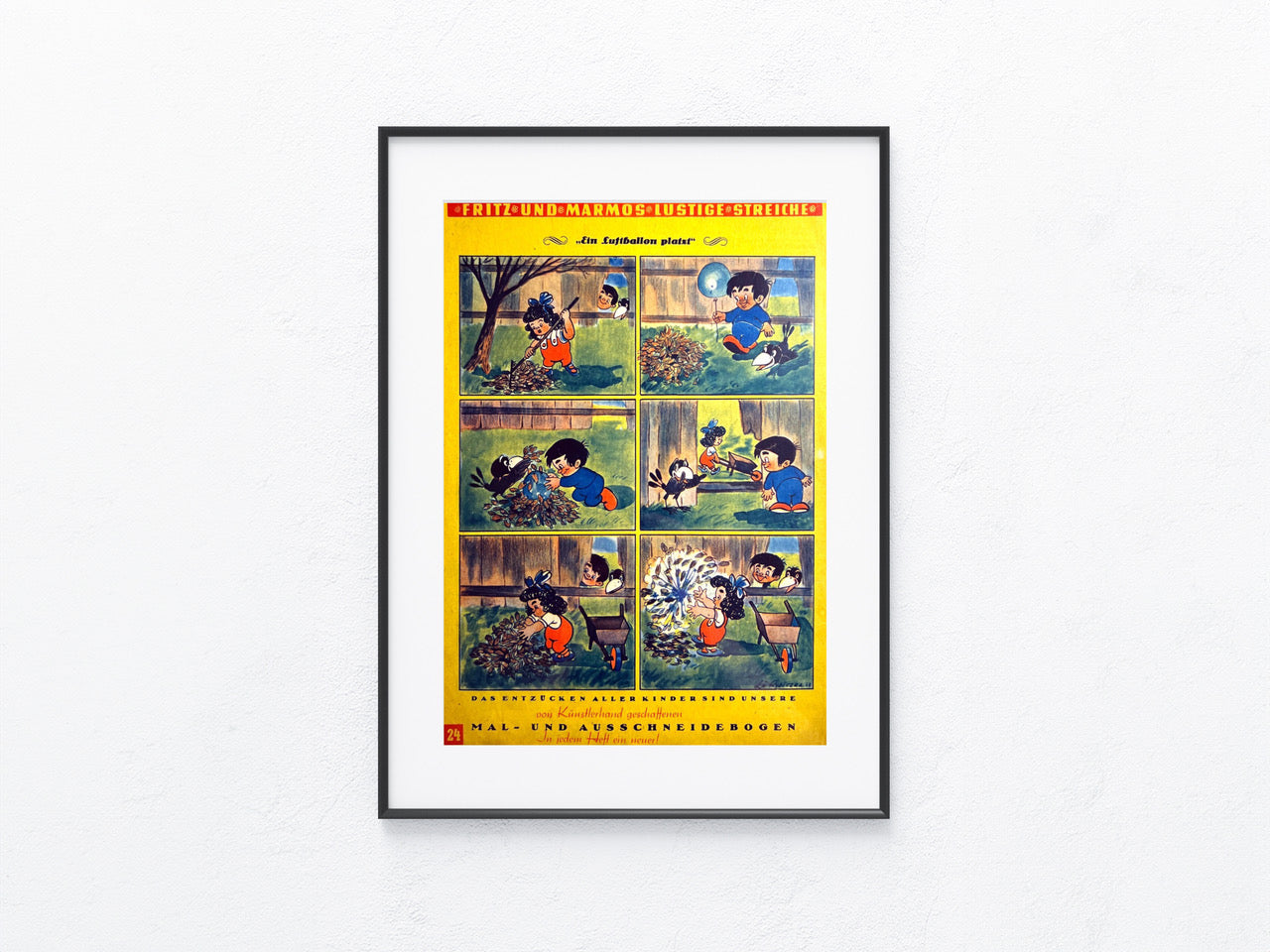 Diese einzigartige Comicseite aus den 1950er Jahren ist ein zeitloses Schmuckstück und eine lebhafte Erinnerung an die goldene Ära der Comics. Die Patina verleiht ihr einen Hauch von Nostalgie und Authentizität, perfekt für alle, die einen Hauch von Retro-Charme in ihrem Zuhause schätzen. Als einzigartiges Original und kein bloßer Nachdruck ist sie ein unverzichtbares Juwel für Comic-Enthusiast*innen und eine stilvolle Bereicherung für jede Sammlung.