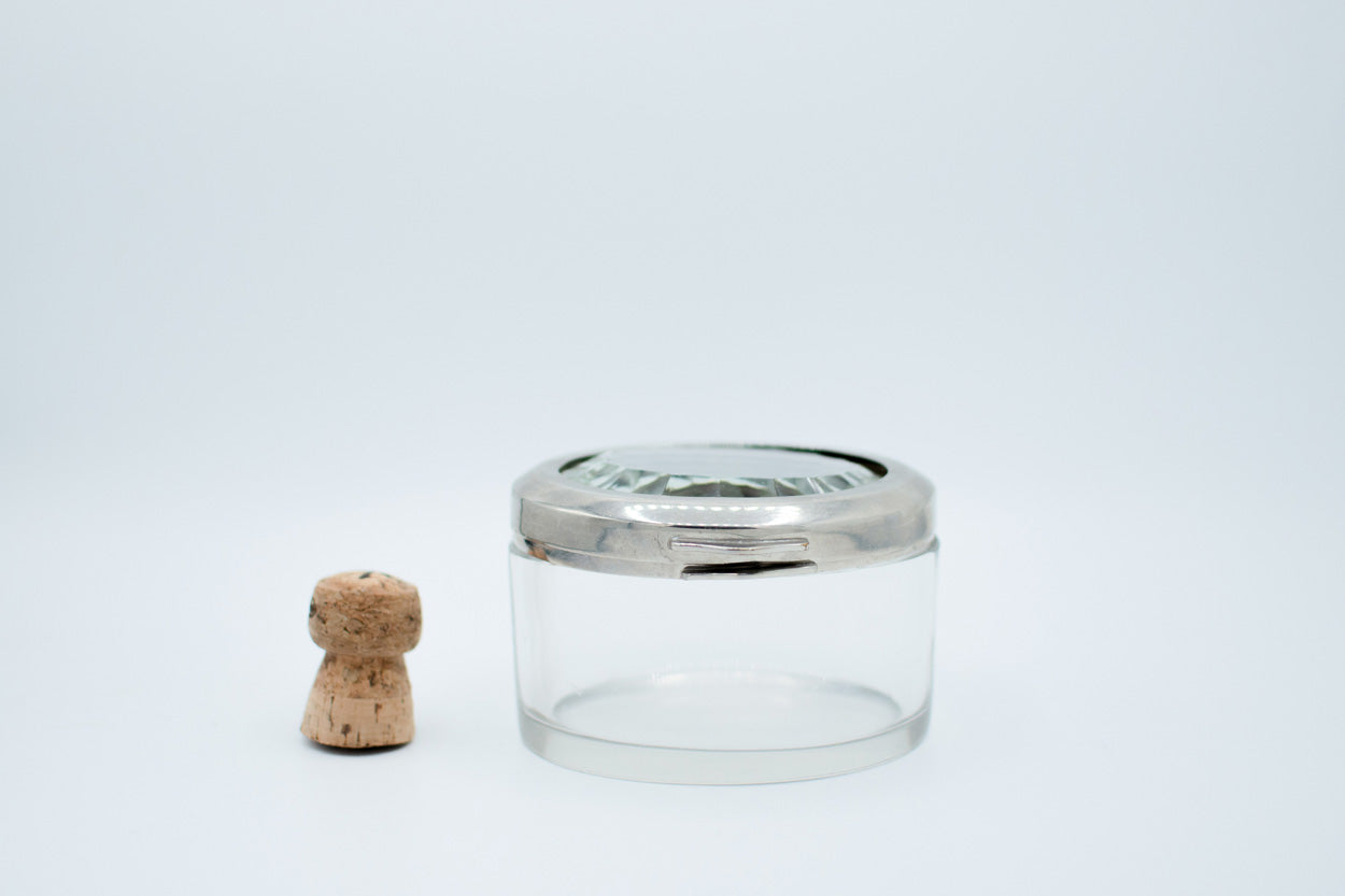 Eine dekorative Glasschatulle aus den 1960er Jahren, veredelt mit feinen Metallbeschlägen. Dieses charmante Stück besticht durch seine elegante Erscheinung und die gekonnte Verbindung von Glas und Metall. Obwohl der Deckel lose und das Glas im Deckel leicht gelockert ist, behält die Schatulle ihren dekorativen Wert und ist ein attraktives Objekt für jede Sammlung oder als Blickfang in Ihrem Raum. Mit ihren kompakten Maßen von 11 cm x 9 cm und einer Höhe von 8,5 cm eignet sie sich ideal zur Aufbewahrung kleiner Schätze oder als elegantes Dekorationselement.