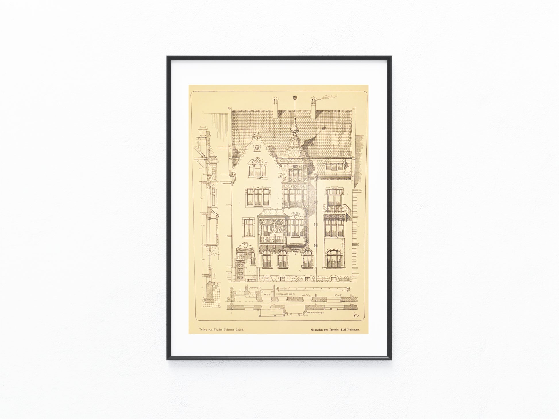 Fein ausgearbeitete Architektur-Tafel „Moderne eingebaute Wohnhäuser“, um 1900 erschienen im Verlag Charles Coleman, Lübeck. Dargestellt ist ein aufwendig gestaltetes Wohnhaus im Jugendstil mit markantem Turmerker, dekorativen Balkonen, kunstvoller Fassadengliederung und ergänzenden Grundrisszeichnungen – ein eindrucksvolles Beispiel für die Bauästhetik des frühen 20. Jahrhunderts.