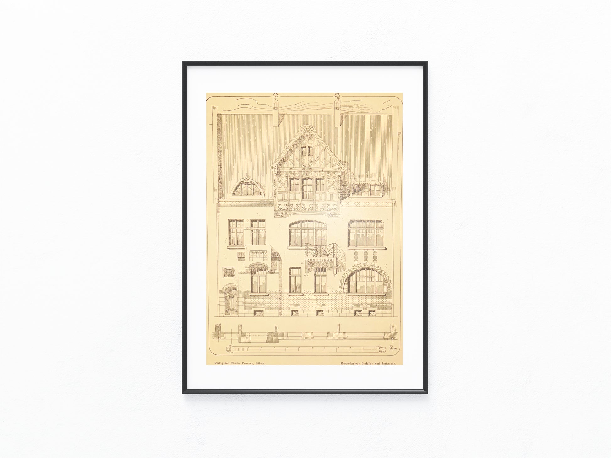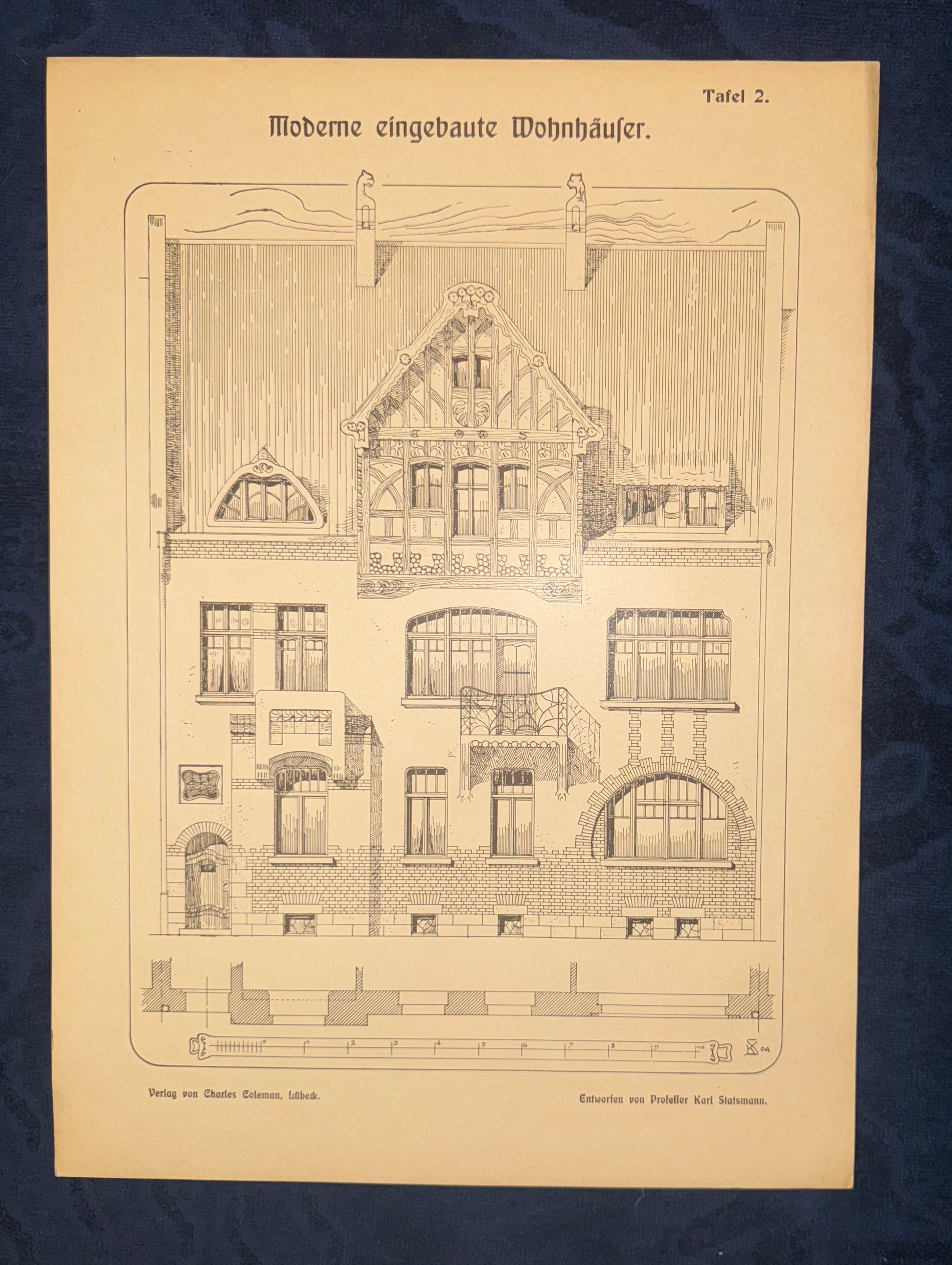 Fein ausgearbeitete Architektur-Tafel „Moderne eingebaute Wohnhäuser“, um 1900 erschienen im Verlag Charles Coleman, Lübeck. Dargestellt ist ein Jugendstil-Wohnhaus mit aufwendig gestaltetem Fachwerkgiebel, kunstvollen Fensterreihen, Rundbogenöffnungen und dekorativem Eingangsbereich – ein ausdrucksstarkes Beispiel städtischer Architektur der Jahrhundertwende.