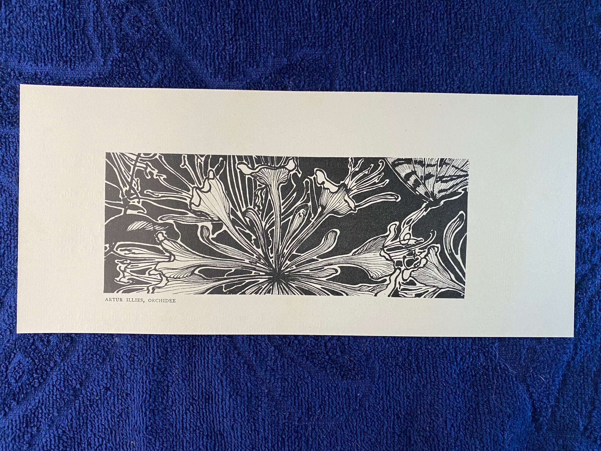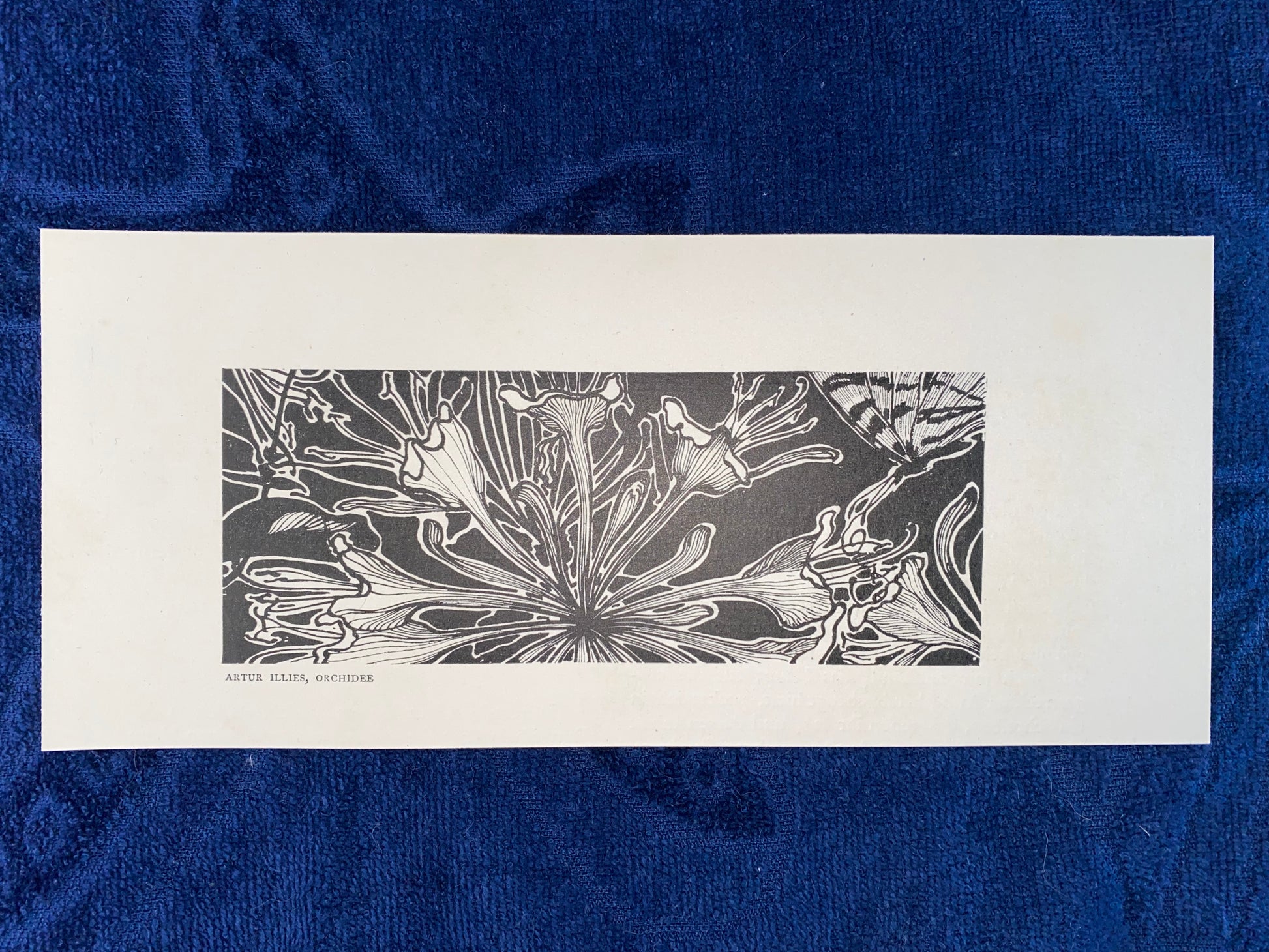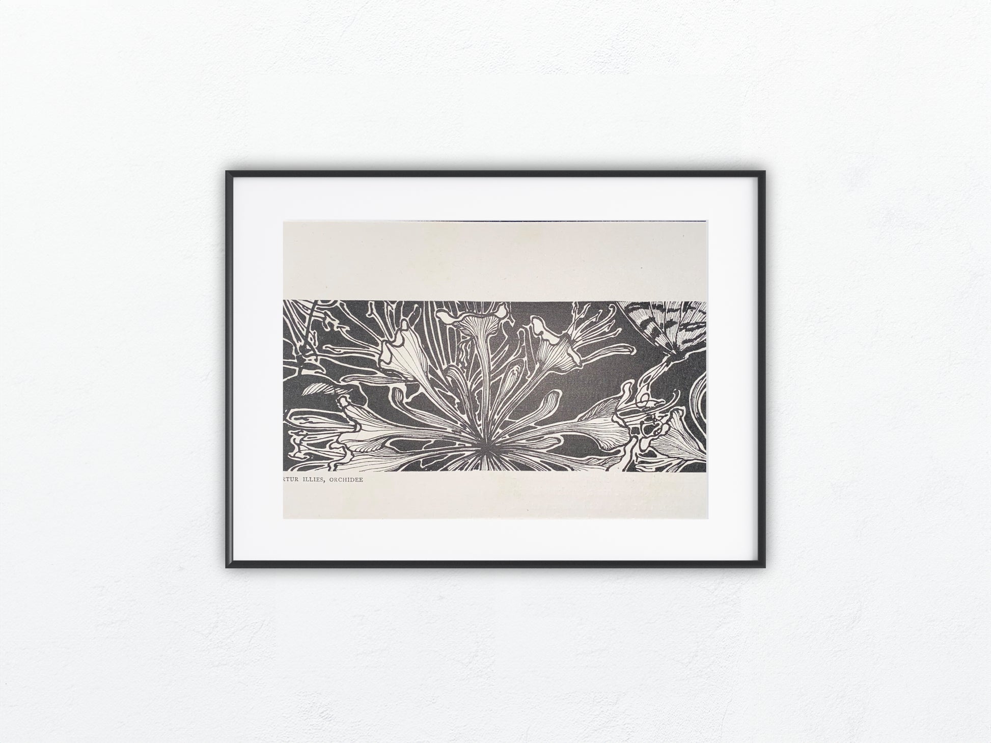 Dekorativer Jugendstildruck von Artur Illies (1870–1952) mit floralem Motiv „Orchidee“, entstanden um 1900. Detailreich gestaltete Blüten in stilisierter Linienführung, ergänzt durch einen Schmetterling – ein typisches Beispiel für die ornamentale Formsprache des Jugendstils. Der Schwarz-Weiß-Kontrast unterstreicht die grafische Wirkung.