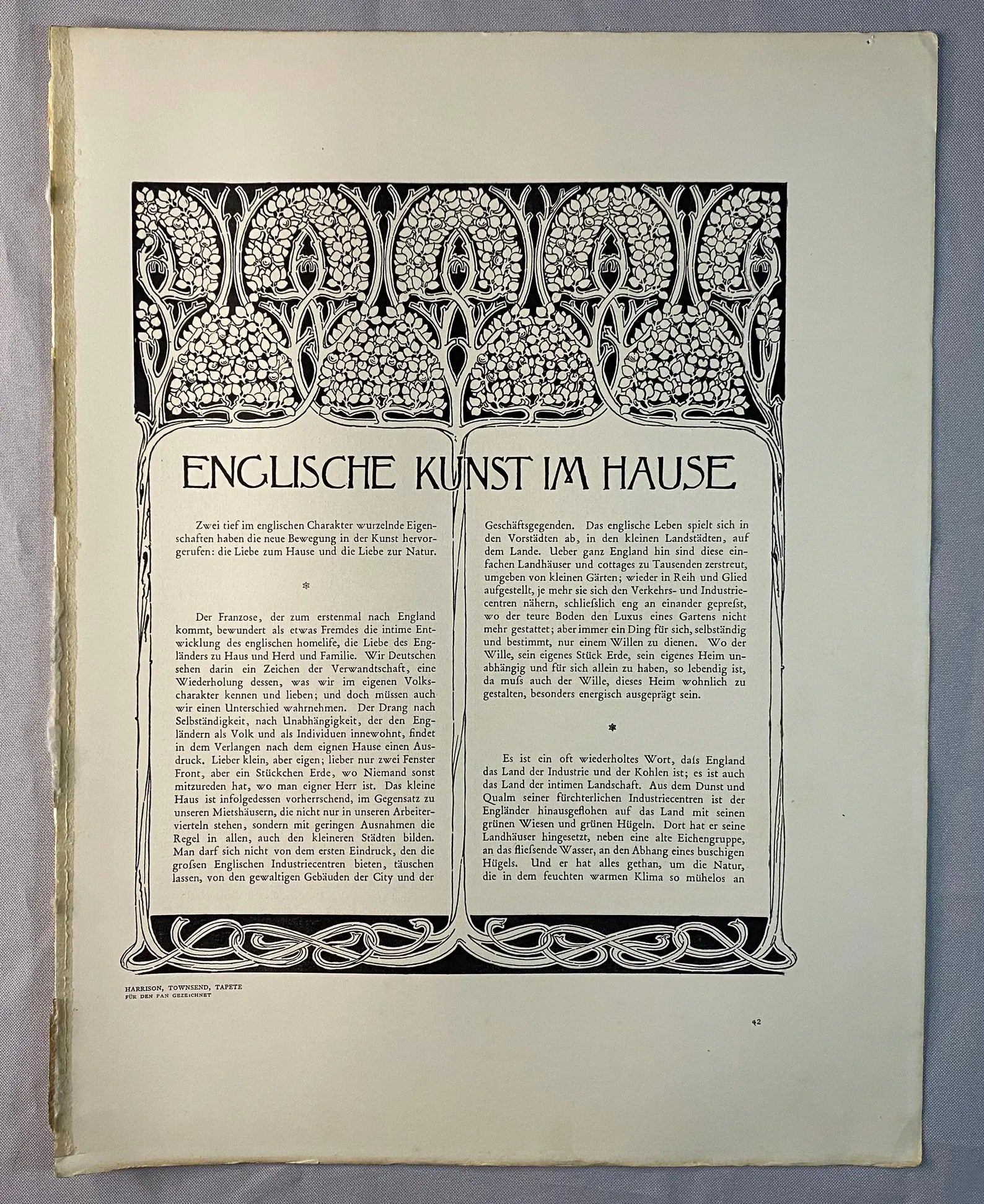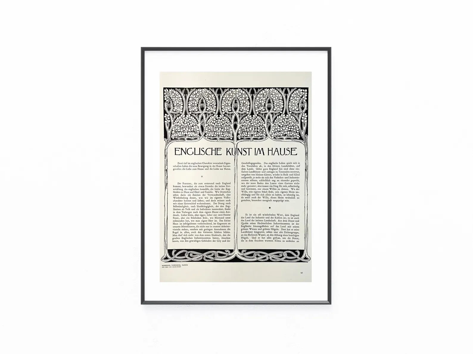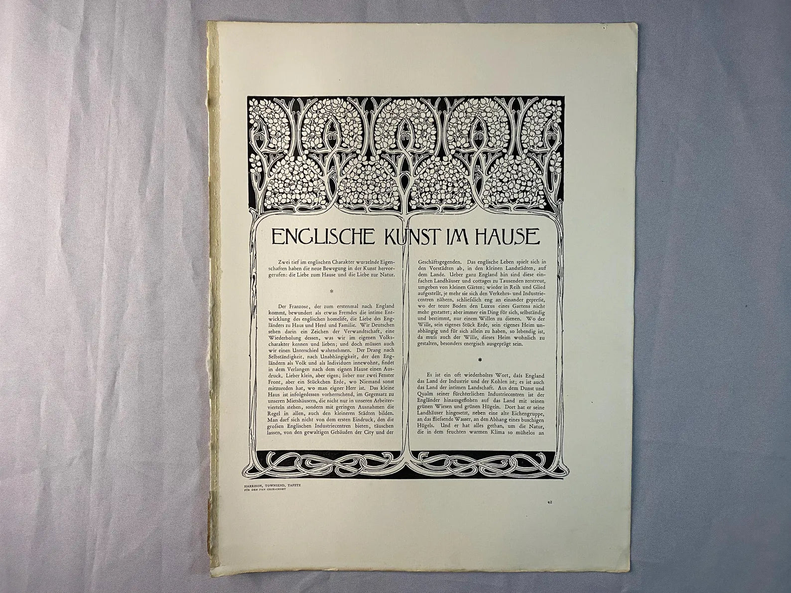 Originaldruck um 1900 mit dem Titel Englische Kunst im Hause. Der Text wird von einem aufwendig gestalteten Jugendstil-Rahmen mit floralen Ornamenten eingefasst. Solche Blätter verbinden typografische Gestaltung, Ornamentik und kulturgeschichtliche Inhalte und sind damit eindrucksvolle Zeugnisse der Jugendstil-Bewegung.