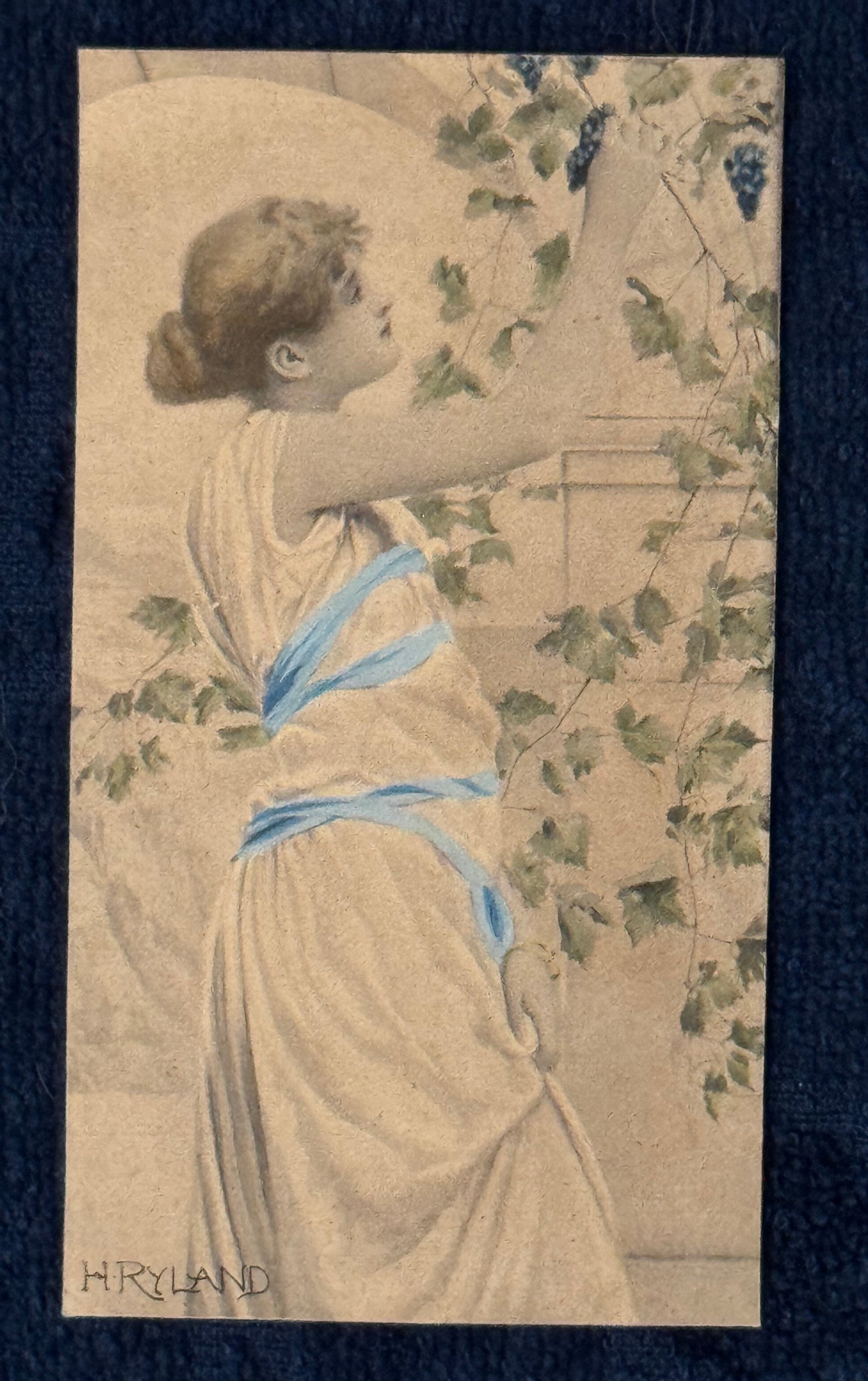 Zarte kleine Gouache- oder Aquarellstudie auf bräunlichem Papier, signiert mit H. Ryland (Henry Ryland, 1856–1924). Dargestellt ist eine junge Frau in klassischer Drapierung, die nach einem Traubenstrauch greift – eine Allegorie auf Natur, Genuss und Schönheit im Stil des späten 19. Jahrhunderts.