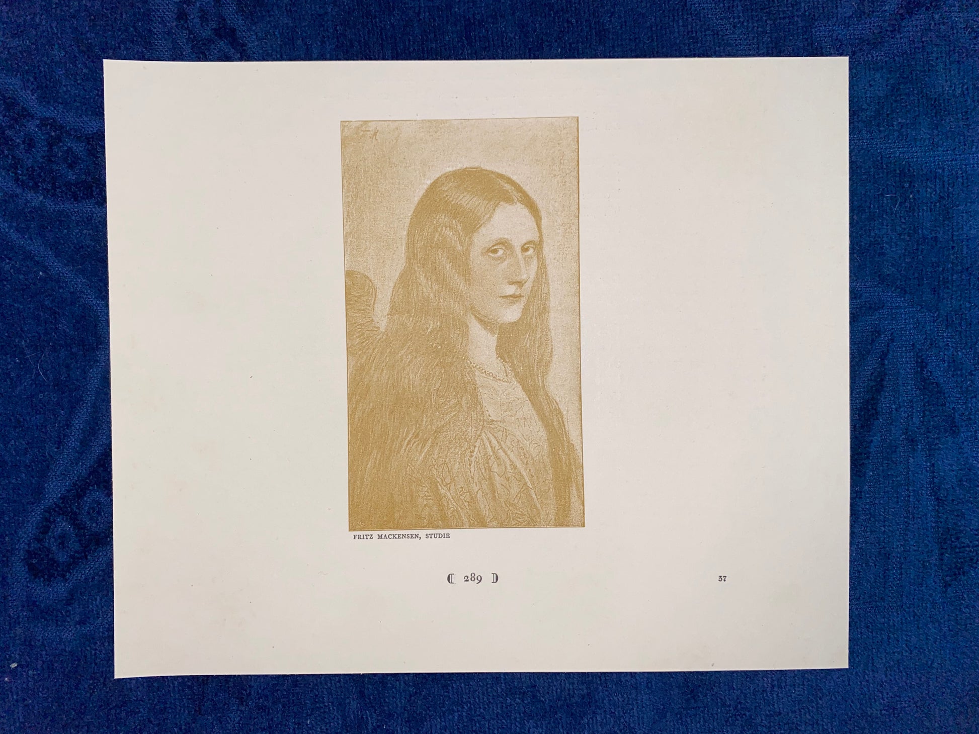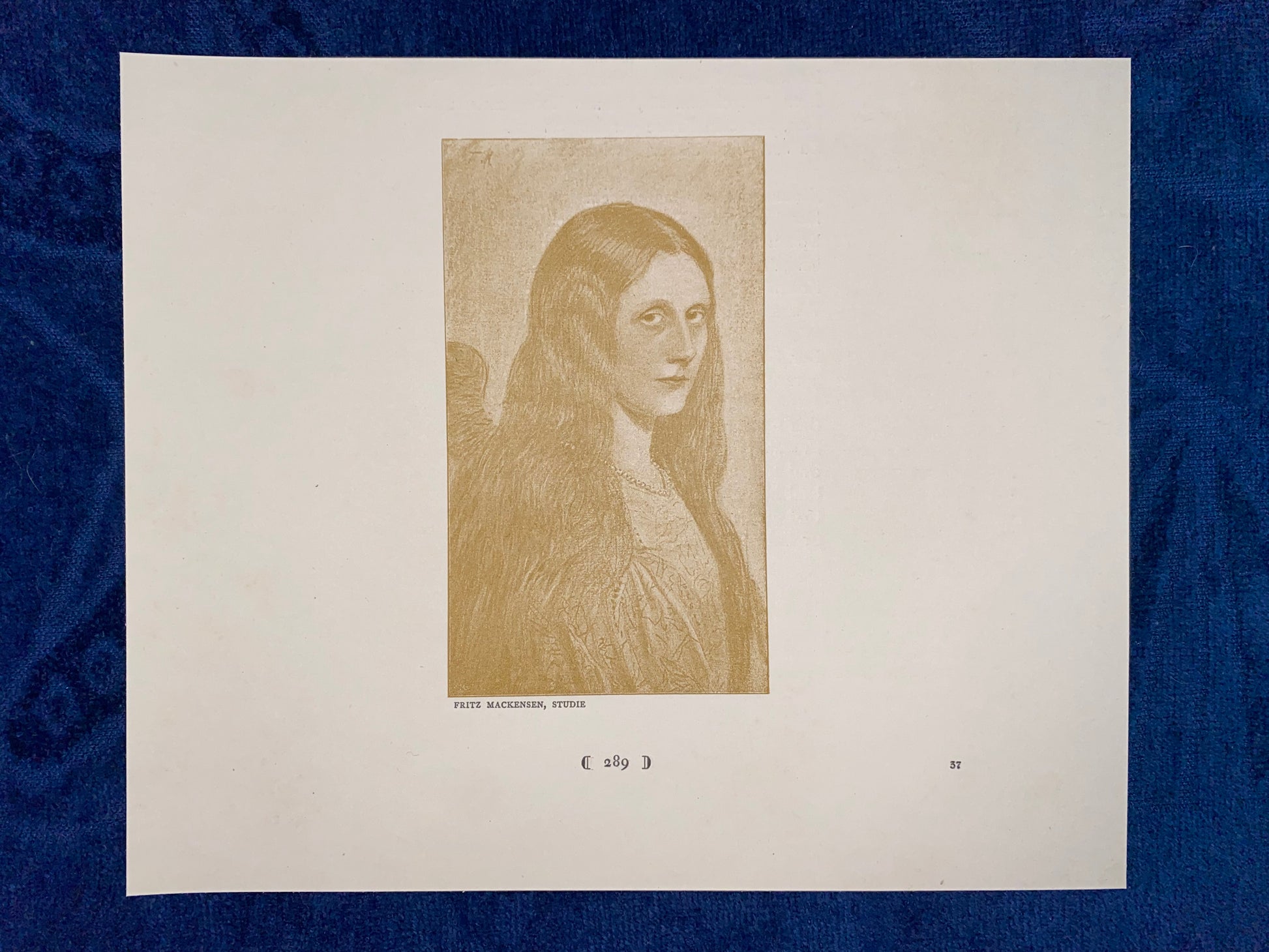 Dekorativer Druck nach Fritz Mackensen (1866–1953), entstanden um 1900. Das Blatt zeigt eine Studie eines Frauenporträts in goldbraunem Ton, detailreich und charaktervoll ausgeführt. Mackensen gehörte zur Künstlerkolonie Worpswede und gilt als wichtiger Vertreter der Kunst um 1900.
