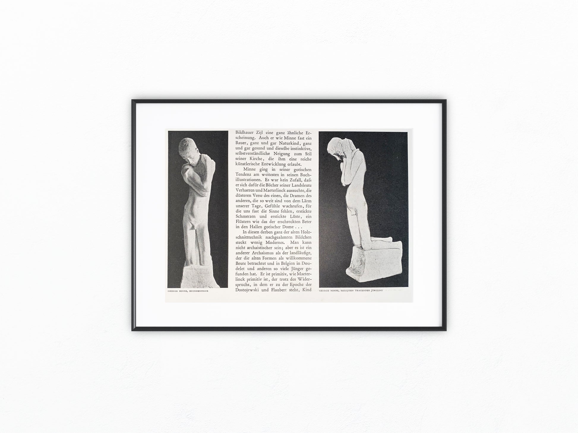 Dekorativer Jugendstildruck nach George Minne (1866–1941), entstanden um 1900. Gezeigt werden zwei seiner bekanntesten Skulpturen: links eine Brunnenfigur, rechts der Reliquien tragende Jüngling. Beide Plastiken verkörpern die für Minne typische Symbolik von Einkehr, Schlichtheit und spiritueller Innigkeit.