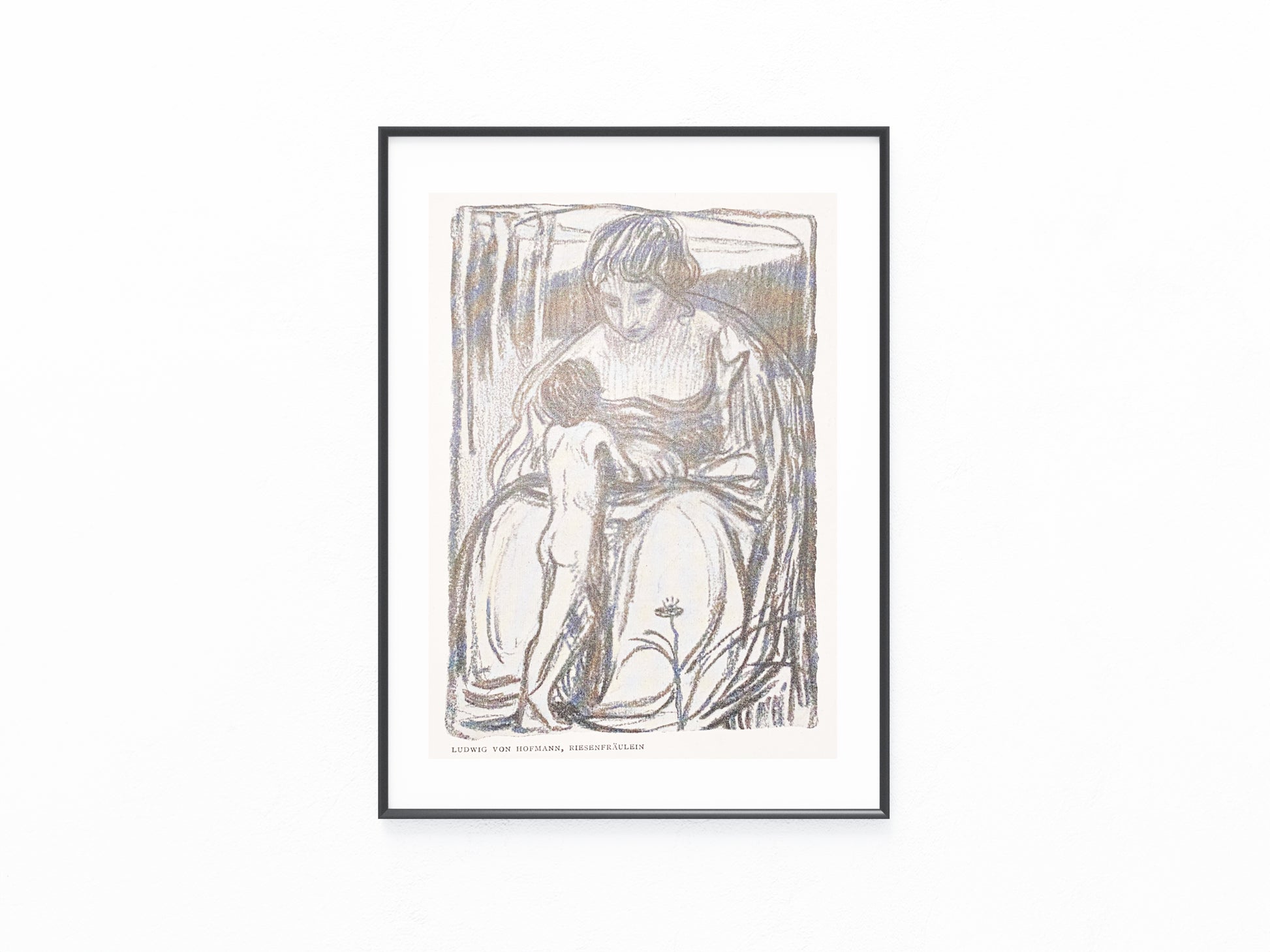 Dekorativer Jugendstildruck nach Ludwig von Hofmann (1861–1945), entstanden um 1900. Das Motiv „Riesenfräulein“ zeigt eine Mutter mit Kind in einer innigen Szene, zart in Linien und Formen gestaltet. Ein feinfühliges Beispiel für Hofmanns humanistische Bildsprache und die ruhige Eleganz des Jugendstils.