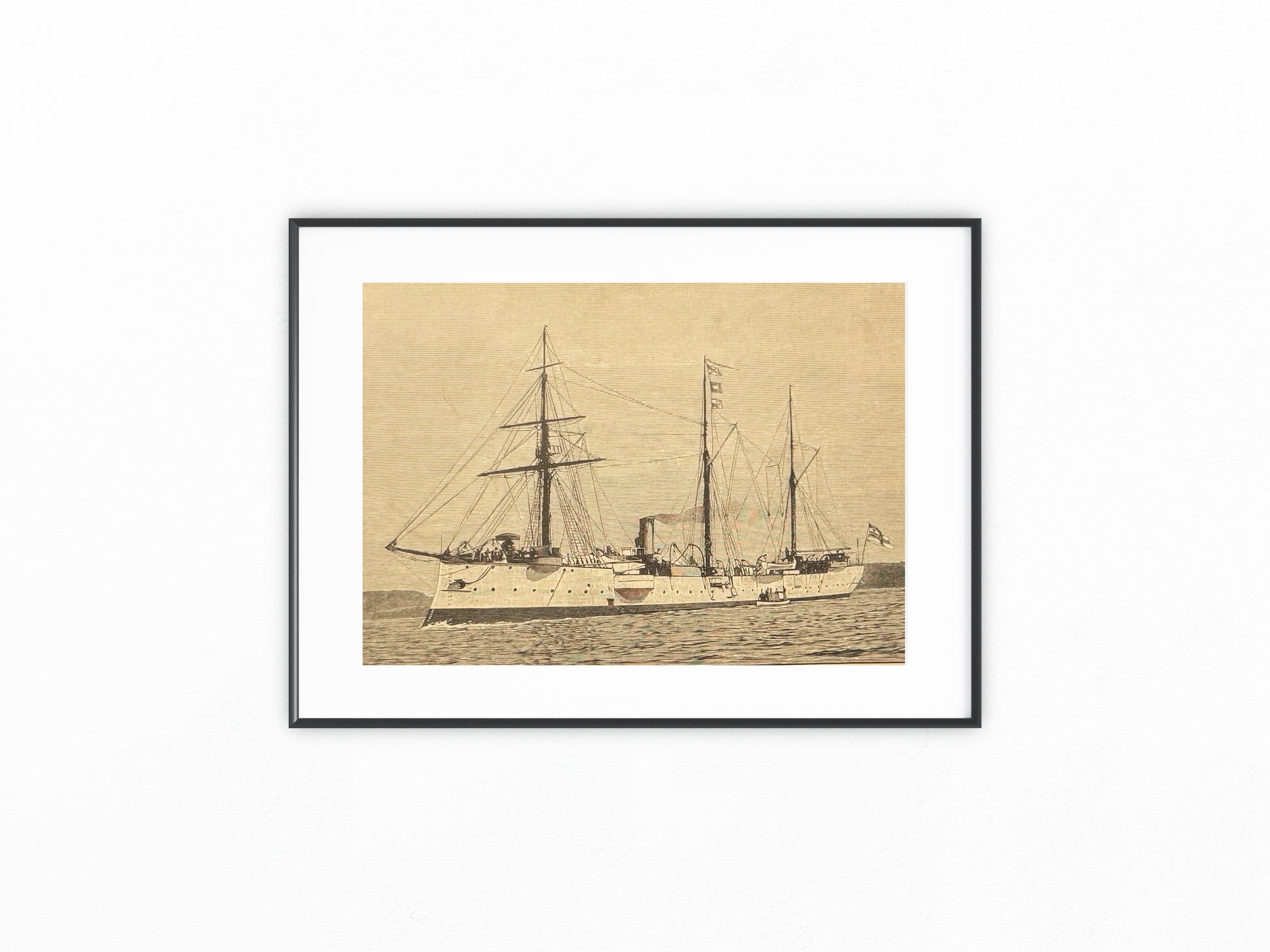 Authentischer Stich aus einer illustrierten Publikation um 1895. Zu sehen ist der neueste Kreuzer 4. Klasse „Geier“ der kaiserlichen Marine in Seitenansicht auf ruhiger See. Die Szene zeigt das Schiff mit voller Takelage, Schornstein und militärischer Ausstattung – eine gelungene Verbindung von Dampf- und Segeltechnik der damaligen Zeit. Unter dem Bild befindet sich der Titel mit Bezug auf die Sonderbeilage der „Reichsflotte“.