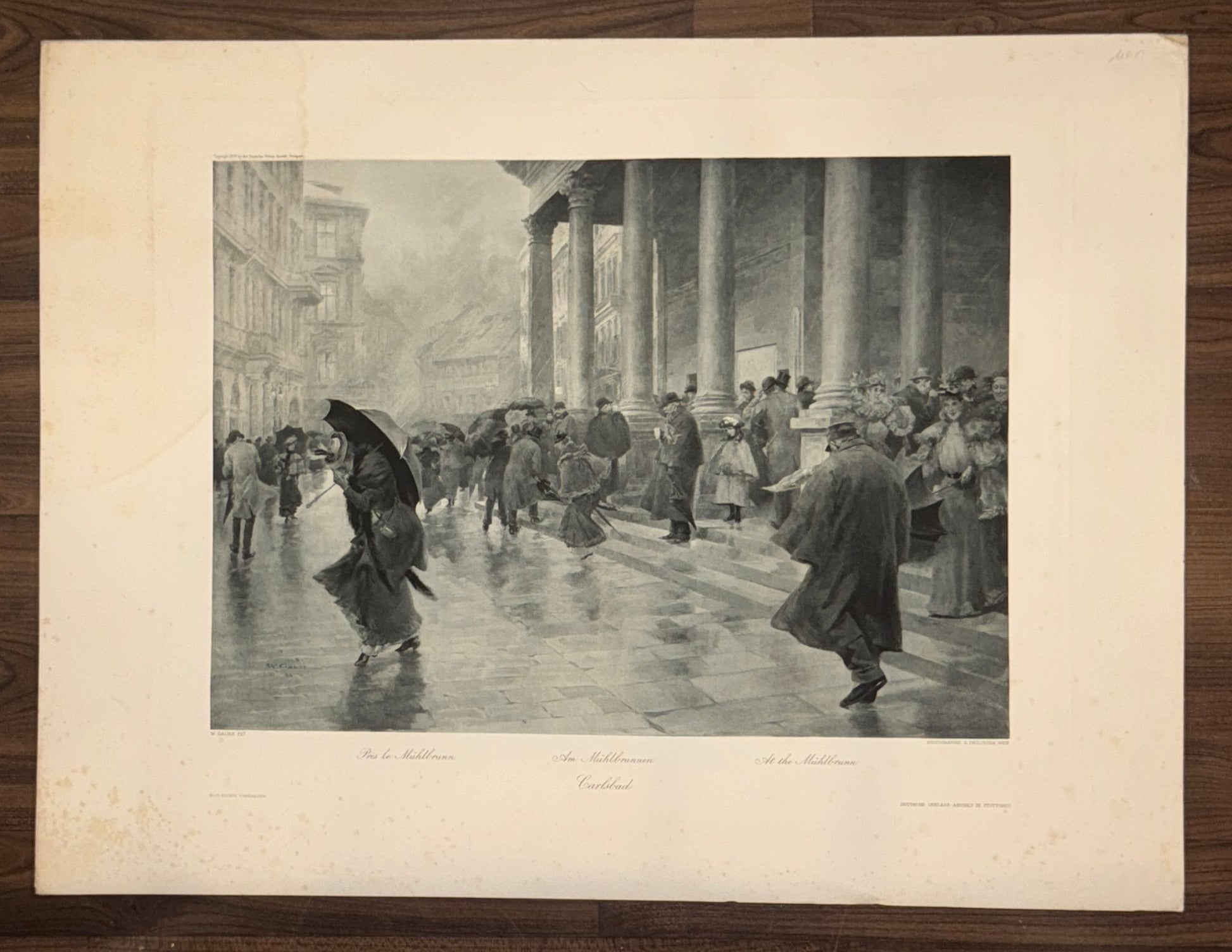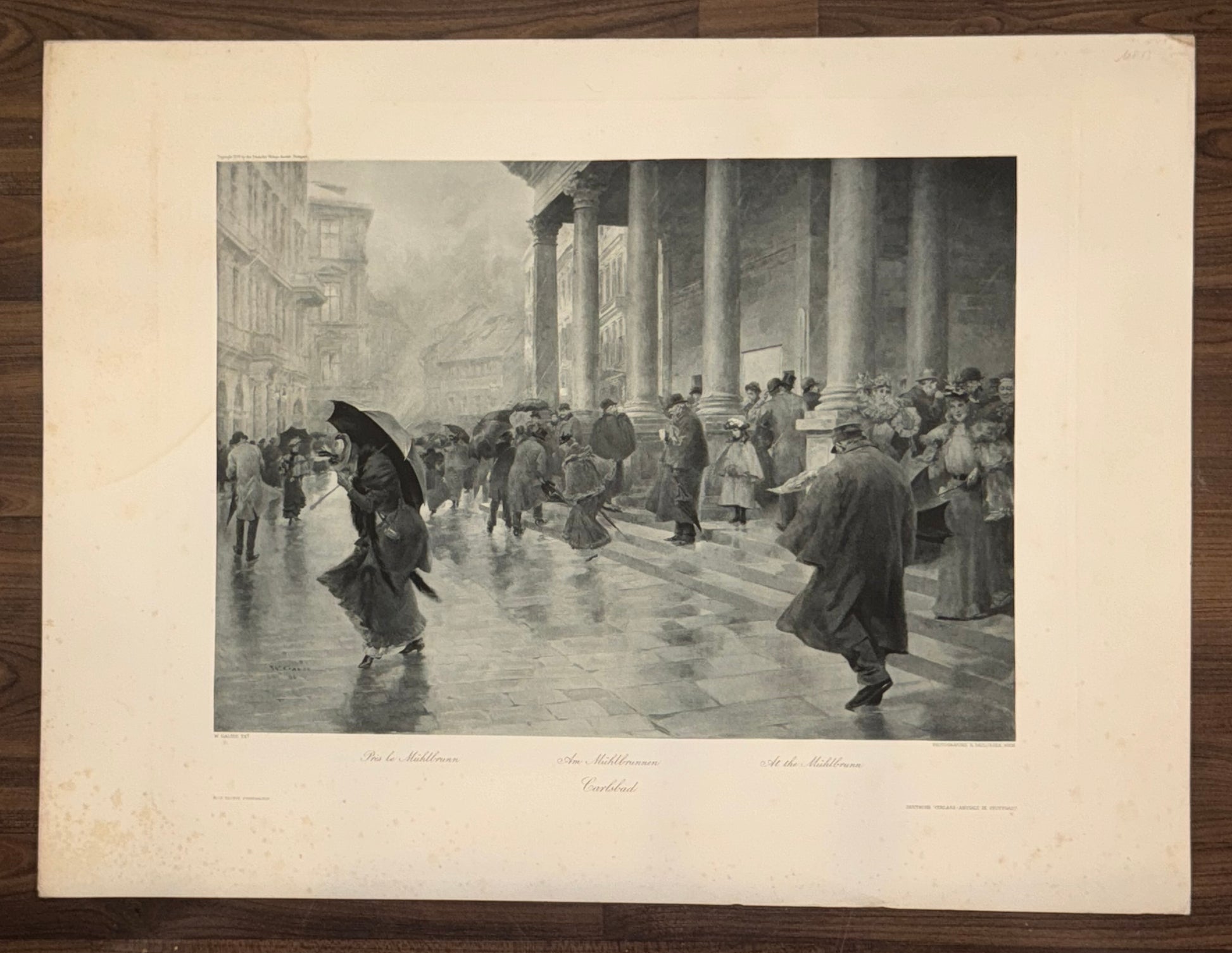 Die eindrucksvolle Darstellung zeigt die belebte Szene am berühmten Mühlbrunnen in Karlsbad um 1890. Besucher mit Schirmen drängen sich unter den Arkaden, während andere eilig über das nasse Pflaster laufen. Trotz des Regens herrscht geschäftiges Treiben – ein authentischer Einblick in das Leben im weltberühmten Kurort, in dem Gesundheit, Gesellschaft und städtisches Flair zusammentrafen.