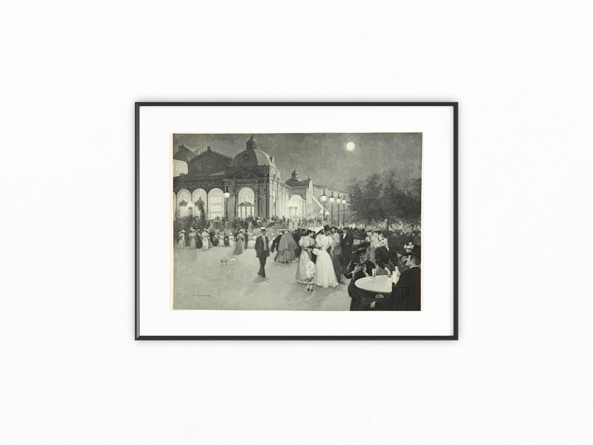 Stimmungsvolle Darstellung aus Karlsbad um 1890: Der beleuchtete Kurpark mit mondheller Nacht, eleganten Kurgästen und festlicher Atmosphäre. Die detailreiche Grafik zeigt den gesellschaftlichen Treffpunkt der Kurstadt und vermittelt ein authentisches Bild der mondänen Bäderkultur des 19. Jahrhunderts.